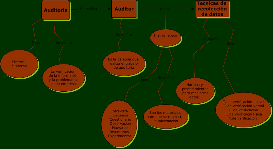 Este Cmap, tiene información relacionada con: Mapa Conceptual, Tecnicas de recolección de datos Tipos T. de verificación ocular T. de verificación verval T. de verificación T. de verificació fisica T.de verificación, Auditoria Tipos *Interna *Externa, Auditor Utiliza Tecnicas de recolección de datos, Auditor Se define Es la persona que realiza el trabajo de auditoria, Instrumentos Tipos Entrevista Encuesta Cuestionario Observación Muestreo Inventarios Experimentos, Tecnicas de recolección de datos Se define Normas y procedimientos para recolectar datos., Auditor Utiliza Instrumentos, Auditoria Se realiza Auditor, Instrumentos Se define Son los materiales con que se recolecta la información, Auditoria Se define La verificación de la información y la problematica de la empresa