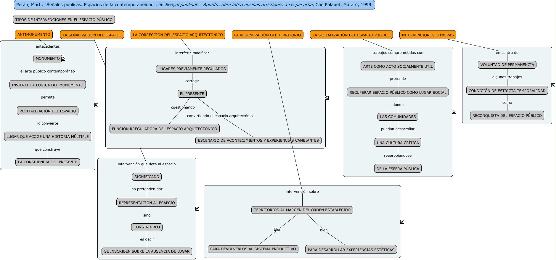 Este Cmap, tiene información relacionada con: Martí Peran, ANTIMONUMENTO antecedentes MONUMENTO, LUGAR QUE ACOGE UNA HISTORIA MÚLTIPLE que construye LA CONSCIENCIA DEL PRESENTE, MONUMENTO triple condición VOLUNTAD DE PERMANENCIA, SIGNIFICADO no pretenden dar REPRESENTACIÓN AL ESAPCIO, VOLUNTAD DE PERMANENCIA algunos trabajos CONDICIÓN DE ESTRICTA TEMPORALIDAD, REPRESENTACIÓN AL ESAPCIO sino CONSTRUIRLO, INVIERTE LA LÓGICA DEL MONUMENTO permite REVITALIZACIÓN DEL ESPACIO, CONDICIÓN DE ESTRICTA TEMPORALIDAD como RECONQUISTA DEL ESPACIO PÚBLICO, EL PRESENTE cuestionando FUNCIÓN RREGULADORA DEL ESPACIO ARQUITECTÓNICO, EL PRESENTE convirtiendo el espacio arquitectónico ESCENARIO DE ACONTECIMIENTOS Y EXPERIENCIAS CAMBIANTES, LA REGENERACIÓN DEL TERRITORIO intervención sobre TERRITORIOS AL MARGEN DEL ORDEN ESTABLECIDO, MONUMENTO triple condición ROL CONMEMORATIVO, REVITALIZACIÓN DEL ESPACIO lo convierte LUGAR QUE ACOGE UNA HISTORIA MÚLTIPLE, UNA CULTURA CRÍTICA reapropiándose DE LA ESFERA PÚBLICA, MONUMENTO triple condición ACOTA UN LUGAR, INTERVENCIONES EFÍMERAS en contra de VOLUNTAD DE PERMANENCIA, RECUPERAR ESPACIO PÚBLICO COMO LUGAR SOCIAL donde LAS COMUNIDADES, ARTE COMO ACTO SOCIALMENTE ÚTIL pretende RECUPERAR ESPACIO PÚBLICO COMO LUGAR SOCIAL, LA SEÑALIZACIÓN DEL ESPACIO intervención que dota al espacio SIGNIFICADO, LUGARES PREVIAMENTE REGULADOS corregir EL PRESENTE