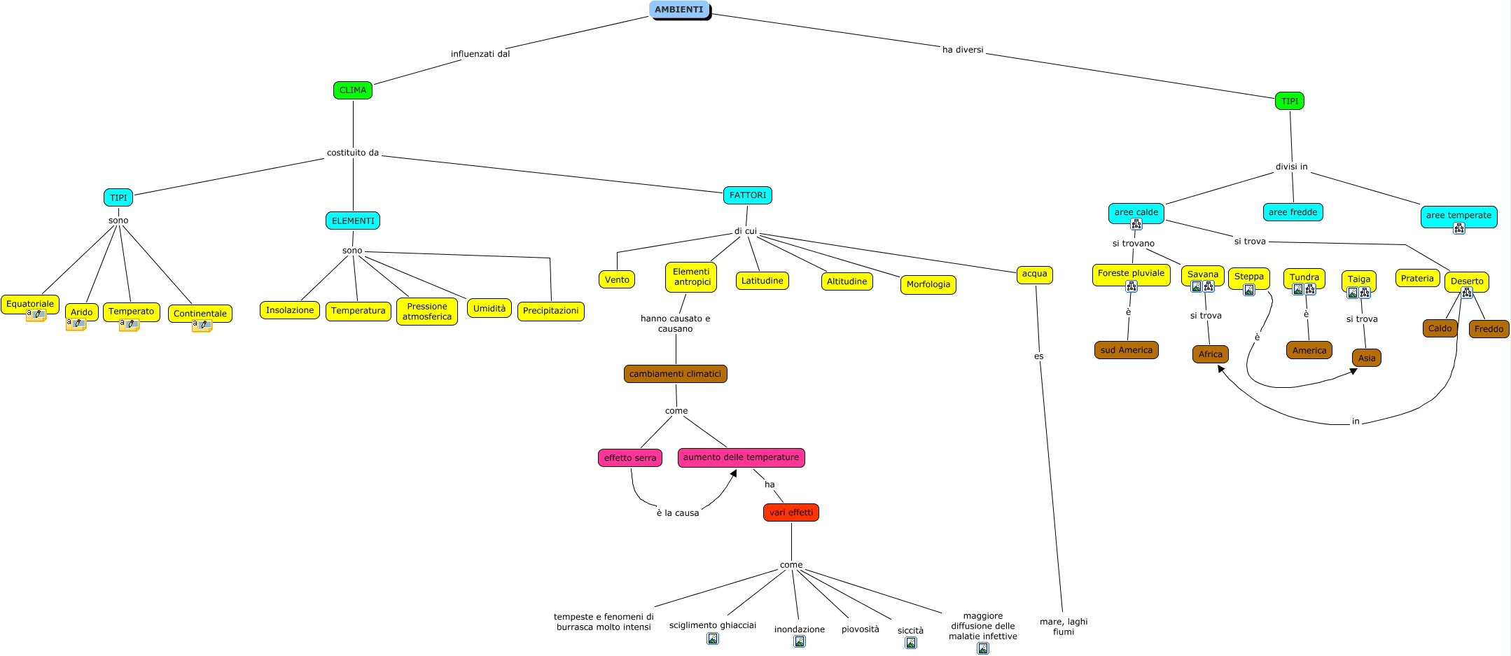 Questa Cmap, creata con IHMC CmapTools, contiene informazioni relative a: Ambienti, Foreste pluviale è sud America, CLIMA costituito da FATTORI, Deserto ???? Freddo, Deserto in Africa, Steppa è Asia, cambiamenti climatici come effetto serra, FATTORI di cui Elementi antropici, AMBIENTI influenzati dal CLIMA, TIPI sono Arido, aree calde si trovano Savana, vari effetti come siccità, FATTORI di cui acqua, TIPI sono Equatoriale, ELEMENTI sono Precipitazioni, acqua es mare, laghi fiumi, FATTORI di cui Vento, CLIMA costituito da ELEMENTI, FATTORI di cui Altitudine, TIPI sono Temperato, FATTORI di cui Latitudine