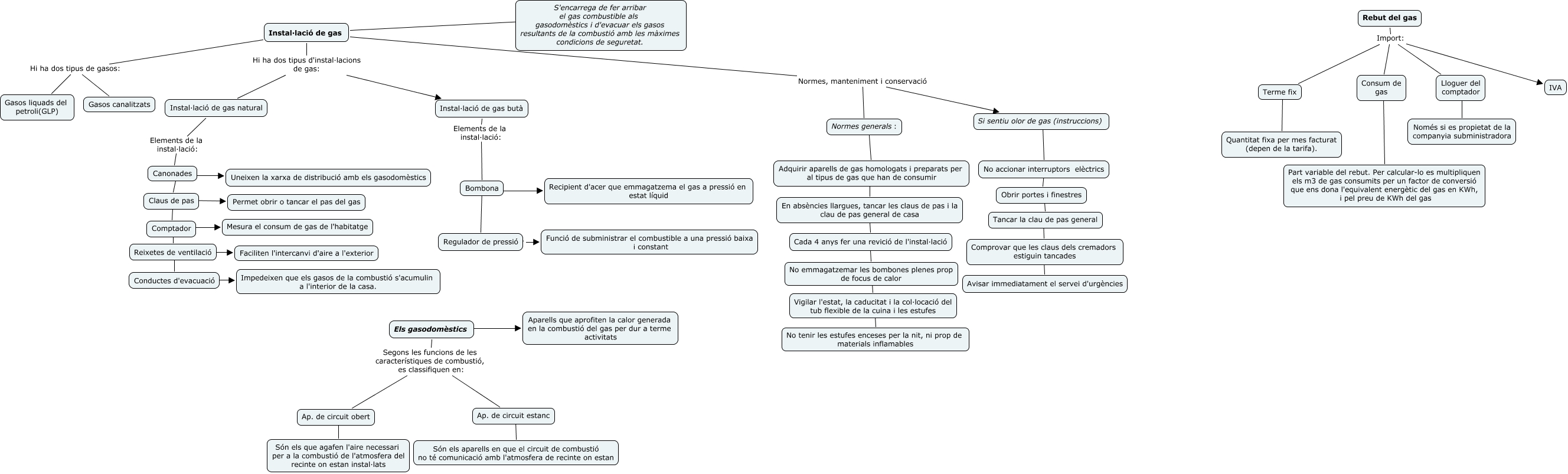Este Cmap, tiene información relacionada con: Ins.gas, Rebut del gas Import: IVA, Ap. de circuit estanc ???? Són els aparells en que el circuit de combustió no té comunicació amb l'atmosfera de recinte on estan, Cada 4 anys fer una revició de l'instal·lació ???? No emmagatzemar les bombones plenes prop de focus de calor, Conductes d'evacuació ???? Impedeixen que els gasos de la combustió s'acumulin a l'interior de la casa., Normes generals: ???? Adquirir aparells de gas homologats i preparats per al tipus de gas que han de consumir, Claus de pas ???? Permet obrir o tancar el pas del gas, Ap. de circuit obert ???? Són els que agafen l'aire necessari per a la combustió de l'atmosfera del recinte on estan instal·lats, Instal·lació de gas ???? S'encarrega de fer arribar el gas combustible als gasodomèstics i d'evacuar els gasos resultants de la combustió amb les màximes condicions de seguretat., Bombona ???? Regulador de pressió, Instal·lació de gas Normes, manteniment i conservació Normes generals:, Terme fix ???? Quantitat fixa per mes facturat (depen de la tarifa)., No accionar interruptors elèctrics ???? Obrir portes i finestres, Consum de gas ???? Part variable del rebut. Per calcular-lo es multipliquen els m3 de gas consumits per un factor de conversió que ens dona l'equivalent energètic del gas en KWh, i pel preu de KWh del gas, Adquirir aparells de gas homologats i preparats per al tipus de gas que han de consumir ???? En absències llargues, tancar les claus de pas i la clau de pas general de casa, Reixetes de ventilació ???? Conductes d'evacuació, Instal·lació de gas butà Elements de la instal·lació: Bombona, Reixetes de ventilació ???? Faciliten l'intercanvi d'aire a l'exterior, Obrir portes i finestres ???? Tancar la clau de pas general, Comptador ???? Mesura el consum de gas de l'habitatge, Comprovar que les claus dels cremadors estiguin tancades ???? Avisar immediatament el servei d'urgències