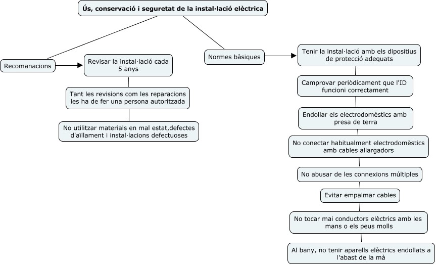 Este Cmap, tiene información relacionada con: Recomanacions i normes, Revisar la instal·lació cada 5 anys ???? Tant les revisions com les reparacions les ha de fer una persona autoritzada, No tocar mai conductors elèctrics amb les mans o els peus molls ???? Al bany, no tenir aparells elèctrics endollats a l'abast de la mà, Tant les revisions com les reparacions les ha de fer una persona autoritzada ???? No utilitzar materials en mal estat,defectes d'aïllament i instal·lacions defectuoses, Ús, conservació i seguretat de la instal·lació elèctrica ???? Normes bàsiques, Normes bàsiques ???? Tenir la instal·lació amb els dipositius de protecció adequats, Tenir la instal·lació amb els dipositius de protecció adequats ???? Camprovar periòdicament que l'ID funcioni correctament, Camprovar periòdicament que l'ID funcioni correctament ???? Endollar els electrodomèstics amb presa de terra, Ús, conservació i seguretat de la instal·lació elèctrica ???? Recomanacions, Evitar empalmar cables ???? No tocar mai conductors elèctrics amb les mans o els peus molls, No abusar de les connexions múltiples ???? Evitar empalmar cables, Endollar els electrodomèstics amb presa de terra ???? No conectar habitualment electrodomèstics amb cables allargadors, No conectar habitualment electrodomèstics amb cables allargadors ???? No abusar de les connexions múltiples, Recomanacions ???? Revisar la instal·lació cada 5 anys