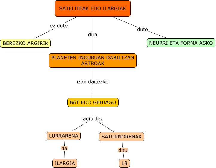 IHMC CmapTools-ekin sortu den kontzeptu-mapa honek honi buruzko informazioa du: TXANELA 1 SATELITEAK EDO ILARGIAK, LURRARENA da ILARGIA, BAT EDO GEHIAGO adibidez LURRARENA, SATURNORENAK ditu 18, SATELITEAK EDO ILARGIAK dira PLANETEN INGURUAN DABILTZAN ASTROAK, SATELITEAK EDO ILARGIAK ez dute BEREZKO ARGIRIK, BAT EDO GEHIAGO adibidez SATURNORENAK, SATELITEAK EDO ILARGIAK dute NEURRI ETA FORMA ASKO, PLANETEN INGURUAN DABILTZAN ASTROAK izan daitezke BAT EDO GEHIAGO