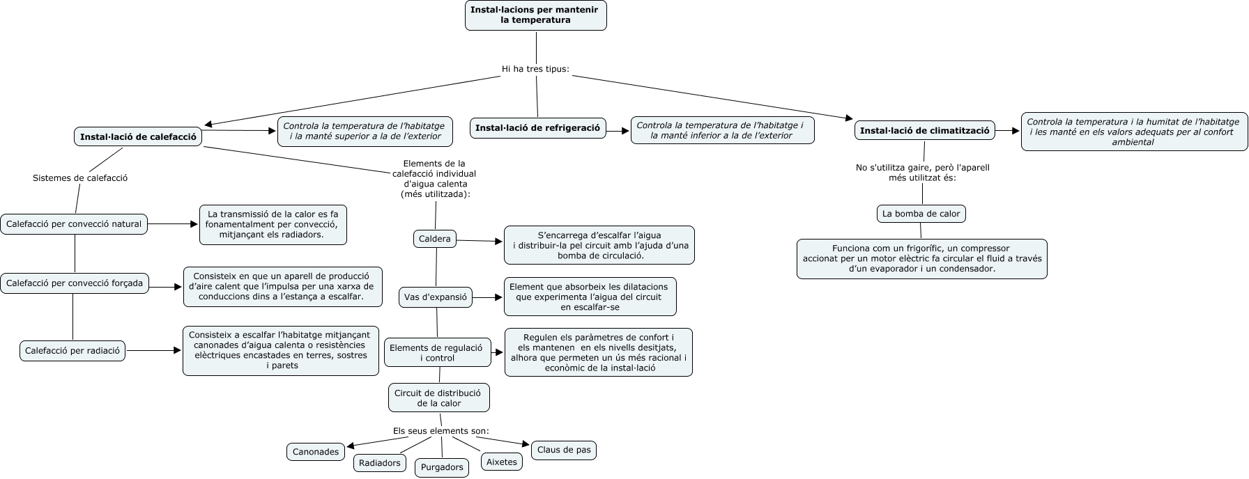 Este Cmap, tiene información relacionada con: Ins. per mantenir la temperatura, Instal·lació de calefacció ???? Controla la temperatura de l’habitatge i la manté superior a la de l’exterior, Calefacció per convecció natural ???? La transmissió de la calor es fa fonamentalment per convecció, mitjançant els radiadors., Instal·lacions per mantenir la temperatura Hi ha tres tipus: Instal·lació de calefacció, Calefacció per convecció forçada ???? Calefacció per radiació, Caldera ???? S’encarrega d’escalfar l’aigua i distribuir-la pel circuit amb l’ajuda d’una bomba de circulació., Instal·lació de calefacció Sistemes de calefacció Calefacció per convecció natural, Instal·lació de calefacció Elements de la calefacció individual d'aigua calenta (més utilitzada): Caldera, Instal·lacions per mantenir la temperatura Hi ha tres tipus: Instal·lació de climatització, Calefacció per convecció forçada ???? Consisteix en que un aparell de producció d’aire calent que l’impulsa per una xarxa de conduccions dins a l’estança a escalfar., Circuit de distribució de la calor Els seus elements son: Aixetes, Caldera ???? Vas d'expansió, Instal·lació de climatització ???? Controla la temperatura i la humitat de l’habitatge i les manté en els valors adequats per al confort ambiental, Elements de regulació i control ???? Regulen els paràmetres de confort i els mantenen en els nivells desitjats, alhora que permeten un ús més racional i econòmic de la instal·lació, Circuit de distribució de la calor Els seus elements son: Purgadors, Instal·lacions per mantenir la temperatura Hi ha tres tipus: Instal·lació de refrigeració, Calefacció per radiació ???? Consisteix a escalfar l’habitatge mitjançant canonades d’aigua calenta o resistències elèctriques encastades en terres, sostres i parets, Circuit de distribució de la calor Els seus elements son: Claus de pas, Vas d'expansió ???? Element que absorbeix les dilatacions que experimenta l’aigua del circuit en escalfar-se, Instal·lació de refrigeració ???? Controla la temperatura de l’habitatge i la manté inferior a la de l’exterior, La bomba de calor ???? Funciona com un frigorífic, un compressor accionat per un motor elèctric fa circular el fluid a través d’un evaporador i un condensador.