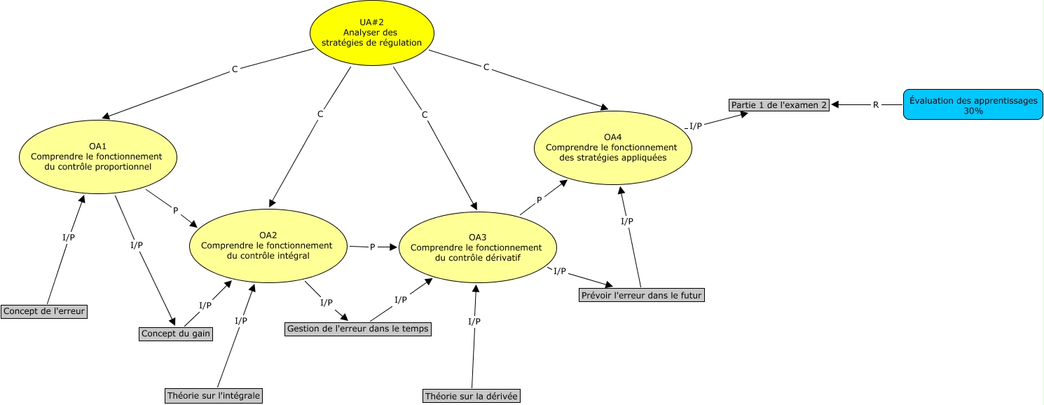 This Concept Map, created with IHMC CmapTools, has information related to: UA2, Concept du gain I/P OA2 Comprendre le fonctionnement du contrôle intégral, Gestion de l'erreur dans le temps I/P OA3 Comprendre le fonctionnement du contrôle dérivatif, UA#2 Analyser des stratégies de régulation C OA4 Comprendre le fonctionnement des stratégies appliquées, Théorie sur la dérivée I/P OA3 Comprendre le fonctionnement du contrôle dérivatif, OA3 Comprendre le fonctionnement du contrôle dérivatif P OA4 Comprendre le fonctionnement des stratégies appliquées, OA2 Comprendre le fonctionnement du contrôle intégral P OA3 Comprendre le fonctionnement du contrôle dérivatif, OA4 Comprendre le fonctionnement des stratégies appliquées I/P Partie 1 de l'examen 2, UA#2 Analyser des stratégies de régulation C OA2 Comprendre le fonctionnement du contrôle intégral, UA#2 Analyser des stratégies de régulation C OA1 Comprendre le fonctionnement du contrôle proportionnel, Prévoir l'erreur dans le futur I/P OA4 Comprendre le fonctionnement des stratégies appliquées, UA#2 Analyser des stratégies de régulation C OA3 Comprendre le fonctionnement du contrôle dérivatif, OA2 Comprendre le fonctionnement du contrôle intégral I/P Gestion de l'erreur dans le temps, OA3 Comprendre le fonctionnement du contrôle dérivatif I/P Prévoir l'erreur dans le futur, Évaluation des apprentissages 30% R Partie 1 de l'examen 2, OA1 Comprendre le fonctionnement du contrôle proportionnel I/P Concept du gain, OA1 Comprendre le fonctionnement du contrôle proportionnel P OA2 Comprendre le fonctionnement du contrôle intégral, Théorie sur l'intégrale I/P OA2 Comprendre le fonctionnement du contrôle intégral, Concept de l'erreur I/P OA1 Comprendre le fonctionnement du contrôle proportionnel