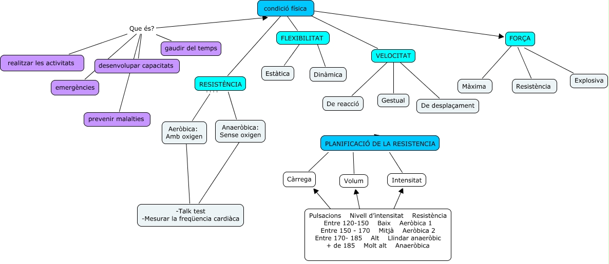Aquest mapa conceptual conté informació relacionada amb: Condició fisica, desenvolupar capacitats Que és? condició física, FLEXIBILITAT ???? Estàtica, -Talk test -Mesurar la freqüencia cardiàca ???? Anaeròbica: Sense oxigen, RESISTÈNCIA ???? Aeròbica: Amb oxigen, Càrrega ???? PLANIFICACIÓ DE LA RESISTENCIA, FORÇA ???? Explosiva, gaudir del temps Que és? prevenir malalties, realitzar les activitats Que és? emergències, Pulsacions Nivell d’intensitat Resistència Entre 120-150 Baix Aeròbica 1 Entre 150 - 170 Mitjà Aeròbica 2 Entre 170- 185 Alt Llindar anaeròbic + de 185 Molt alt Anaeròbica ???? Volum, Dinàmica ???? FLEXIBILITAT, VELOCITAT ???? De desplaçament, desenvolupar capacitats Que és? emergències, Intensitat ???? PLANIFICACIÓ DE LA RESISTENCIA, condició física ???? RESISTÈNCIA, condició física ???? VELOCITAT, realitzar les activitats Que és? prevenir malalties, Aeròbica: Amb oxigen ???? -Talk test -Mesurar la freqüencia cardiàca, Pulsacions Nivell d’intensitat Resistència Entre 120-150 Baix Aeròbica 1 Entre 150 - 170 Mitjà Aeròbica 2 Entre 170- 185 Alt Llindar anaeròbic + de 185 Molt alt Anaeròbica ???? Intensitat, condició física ???? FLEXIBILITAT, RESISTÈNCIA ???? Anaeròbica: Sense oxigen