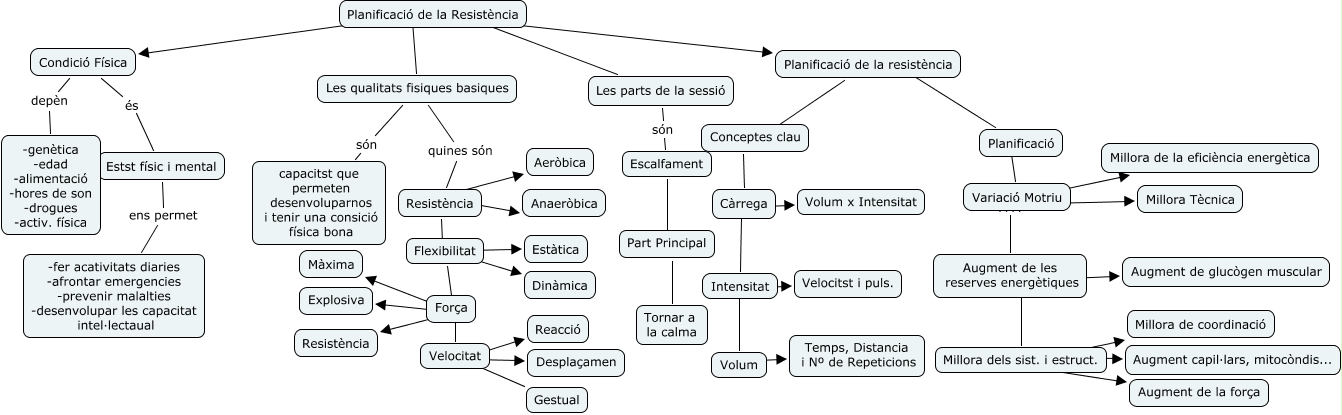 This Concept Map, created with IHMC CmapTools, has information related to: E.F, Resistència ???? Anaeròbica, Conceptes clau ???? Càrrega, Escalfament ???? Part Principal, Condició Física depèn -genètica -edad -alimentació -hores de son -drogues -activ. física, Millora dels sist. i estruct. ???? Augment capil·lars, mitocòndis..., Planificació de la Resistència ???? Les qualitats fisiques basiques, Resistència ???? Flexibilitat, Variació Motriu ???? Millora de la eficiència energètica, Velocitat ???? Gestual, Variació Motriu ???? Millora Tècnica, Intensitat ???? Velocitst i puls., Condició Física és Estst físic i mental, Planificació de la Resistència ???? Planificació de la resistència, Força ???? Velocitat, Planificació de la resistència ???? Planificació, Planificació de la Resistència ???? Condició Física, Càrrega ???? Volum x Intensitat, Planificació de la resistència ???? Conceptes clau, Força ???? Explosiva, Força ???? Màxima