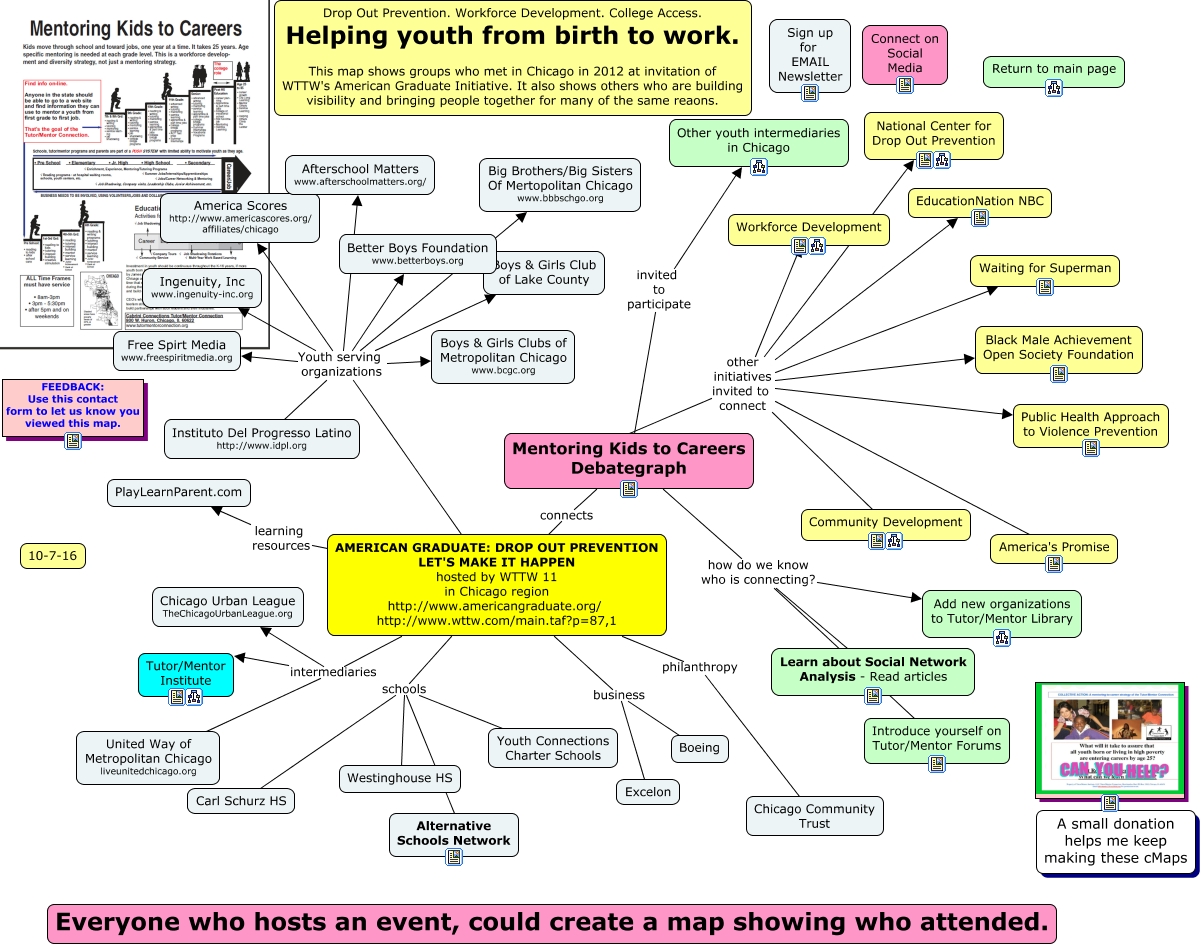 This Concept Map, created with IHMC CmapTools, has information related to: Connecting Networks of Support, AMERICAN GRADUATE: DROP OUT PREVENTION LET'S MAKE IT HAPPEN hosted by WTTW 11 in Chicago region http://www.americangraduate.org/ http://www.wttw.com/main.taf?p=87,1 schools Youth Connections Charter Schools, Mentoring Kids to Careers Debategraph other initiatives invited to connect Workforce Development, Mentoring Kids to Careers Debategraph connects AMERICAN GRADUATE: DROP OUT PREVENTION LET'S MAKE IT HAPPEN hosted by WTTW 11 in Chicago region http://www.americangraduate.org/ http://www.wttw.com/main.taf?p=87,1, AMERICAN GRADUATE: DROP OUT PREVENTION LET'S MAKE IT HAPPEN hosted by WTTW 11 in Chicago region http://www.americangraduate.org/ http://www.wttw.com/main.taf?p=87,1 philanthropy Chicago Community Trust, AMERICAN GRADUATE: DROP OUT PREVENTION LET'S MAKE IT HAPPEN hosted by WTTW 11 in Chicago region http://www.americangraduate.org/ http://www.wttw.com/main.taf?p=87,1 intermediaries United Way of Metropolitan Chicago liveunitedchicago.org, AMERICAN GRADUATE: DROP OUT PREVENTION LET'S MAKE IT HAPPEN hosted by WTTW 11 in Chicago region http://www.americangraduate.org/ http://www.wttw.com/main.taf?p=87,1 business Boeing, AMERICAN GRADUATE: DROP OUT PREVENTION LET'S MAKE IT HAPPEN hosted by WTTW 11 in Chicago region http://www.americangraduate.org/ http://www.wttw.com/main.taf?p=87,1 business Excelon, Mentoring Kids to Careers Debategraph other initiatives invited to connect Community Development, AMERICAN GRADUATE: DROP OUT PREVENTION LET'S MAKE IT HAPPEN hosted by WTTW 11 in Chicago region http://www.americangraduate.org/ http://www.wttw.com/main.taf?p=87,1 schools Alternative Schools Network, AMERICAN GRADUATE: DROP OUT PREVENTION LET'S MAKE IT HAPPEN hosted by WTTW 11 in Chicago region http://www.americangraduate.org/ http://www.wttw.com/main.taf?p=87,1 Youth serving organizations Boys & Girls Clubs of Metropolitan Chicago www.bcgc.org, Mentoring Kids to Careers Debategraph invited to participate Other youth intermediaries in Chicago, Mentoring Kids to Careers Debategraph how do we know who is connecting? Introduce yourself on Tutor/Mentor Forums, AMERICAN GRADUATE: DROP OUT PREVENTION LET'S MAKE IT HAPPEN hosted by WTTW 11 in Chicago region http://www.americangraduate.org/ http://www.wttw.com/main.taf?p=87,1 schools Westinghouse HS, AMERICAN GRADUATE: DROP OUT PREVENTION LET'S MAKE IT HAPPEN hosted by WTTW 11 in Chicago region http://www.americangraduate.org/ http://www.wttw.com/main.taf?p=87,1 learning resources PlayLearnParent.com, Mentoring Kids to Careers Debategraph other initiatives invited to connect EducationNation NBC, AMERICAN GRADUATE: DROP OUT PREVENTION LET'S MAKE IT HAPPEN hosted by WTTW 11 in Chicago region http://www.americangraduate.org/ http://www.wttw.com/main.taf?p=87,1 Youth serving organizations Afterschool Matters www.afterschoolmatters.org/, AMERICAN GRADUATE: DROP OUT PREVENTION LET'S MAKE IT HAPPEN hosted by WTTW 11 in Chicago region http://www.americangraduate.org/ http://www.wttw.com/main.taf?p=87,1 Youth serving organizations America Scores http://www.americascores.org/ affiliates/chicago, AMERICAN GRADUATE: DROP OUT PREVENTION LET'S MAKE IT HAPPEN hosted by WTTW 11 in Chicago region http://www.americangraduate.org/ http://www.wttw.com/main.taf?p=87,1 Youth serving organizations Boys & Girls Club of Lake County, Mentoring Kids to Careers Debategraph other initiatives invited to connect Black Male Achievement Open Society Foundation, Mentoring Kids to Careers Debategraph other initiatives invited to connect Waiting for Superman