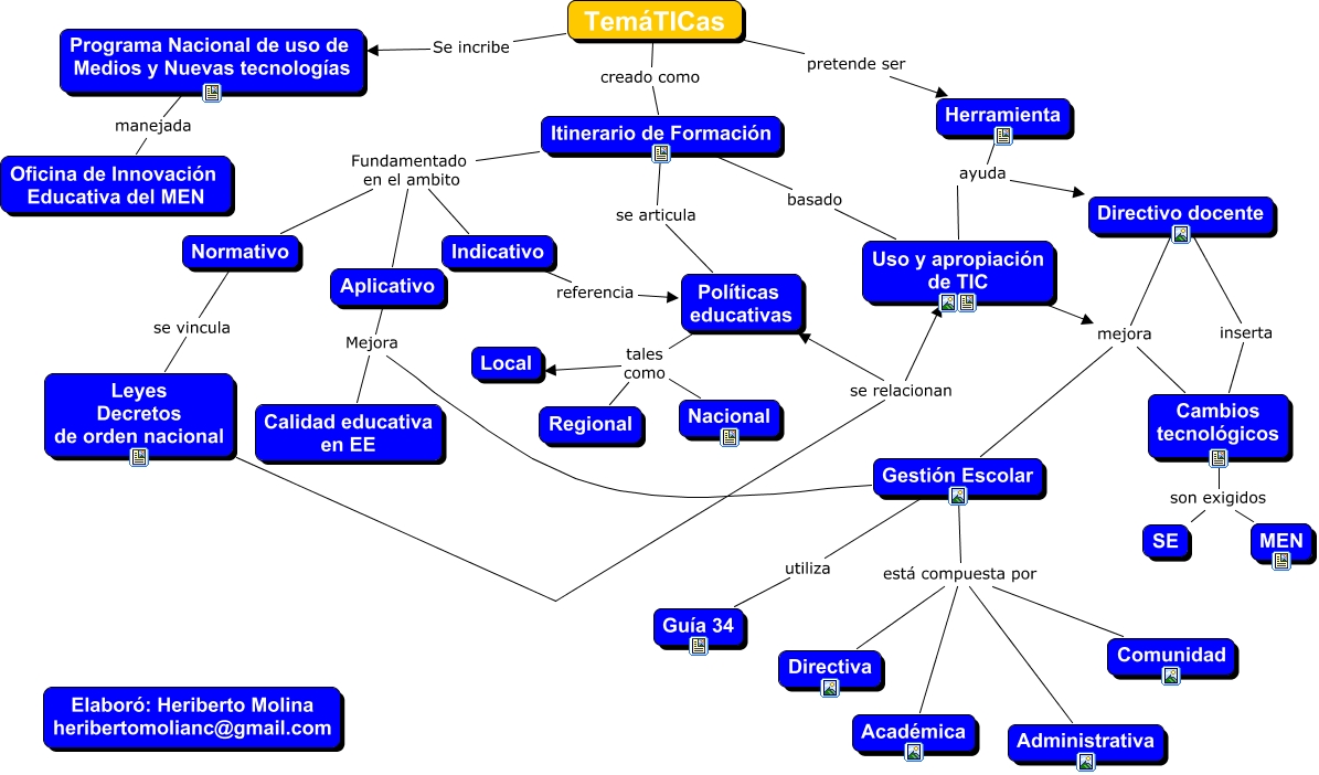 Este Cmap, tiene información relacionada con: referentes políticas educativas, TemáTICas Se incribe Programa Nacional de uso de Medios y Nuevas tecnologías, Aplicativo Mejora Calidad educativa en EE, Indicativo referencia Políticas educativas, Itinerario de Formación Fundamentado en el ambito Aplicativo, Herramienta ayuda Directivo docente, Cambios tecnológicos son exigidos MEN, Gestión Escolar está compuesta por Académica, Itinerario de Formación Fundamentado en el ambito Indicativo, Directivo docente mejora Gestión Escolar, Gestión Escolar está compuesta por Administrativa, TemáTICas creado como Itinerario de Formación, Gestión Escolar Mejora Calidad educativa en EE, Políticas educativas tales como Regional, Gestión Escolar está compuesta por Comunidad, Programa Nacional de uso de Medios y Nuevas tecnologías manejada Oficina de Innovación Educativa del MEN, Normativo se vincula Leyes Decretos de orden nacional, Gestión Escolar está compuesta por Directiva, Itinerario de Formación Fundamentado en el ambito Normativo, Uso y apropiación de TIC ayuda Directivo docente, Políticas educativas tales como Local