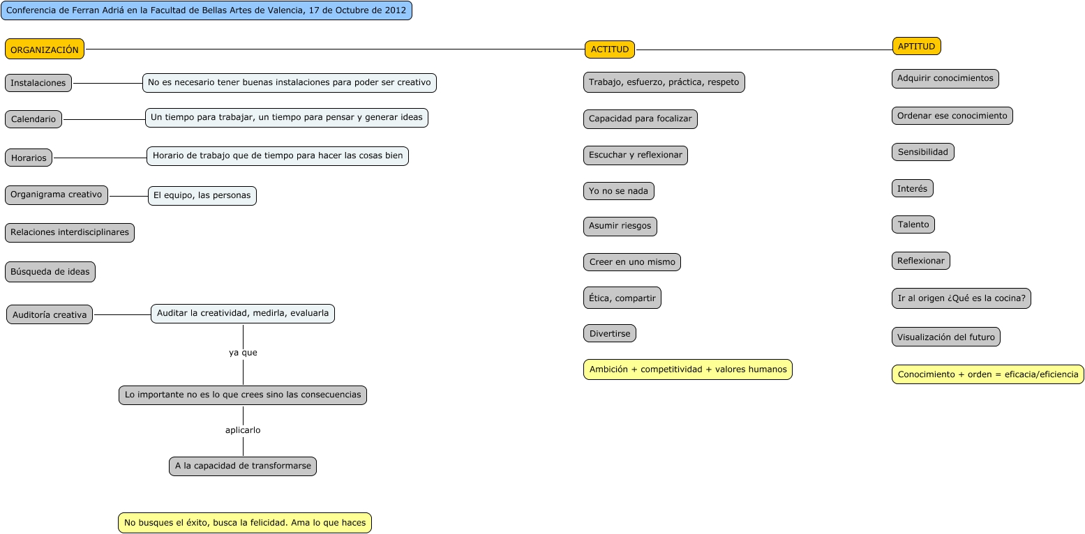 Este Cmap, tiene información relacionada con: Ferran Adriá, Auditar la creatividad, medirla, evaluarla ya que Lo importante no es lo que crees sino las consecuencias, Lo importante no es lo que crees sino las consecuencias aplicarlo A la capacidad de transformarse, ACTITUD ???? APTITUD, Calendario ???? Un tiempo para trabajar, un tiempo para pensar y generar ideas, ORGANIZACIÓN ???? ACTITUD, Horarios ???? Horario de trabajo que de tiempo para hacer las cosas bien, Instalaciones ???? No es necesario tener buenas instalaciones para poder ser creativo, Organigrama creativo ???? El equipo, las personas, Auditoría creativa ???? Auditar la creatividad, medirla, evaluarla