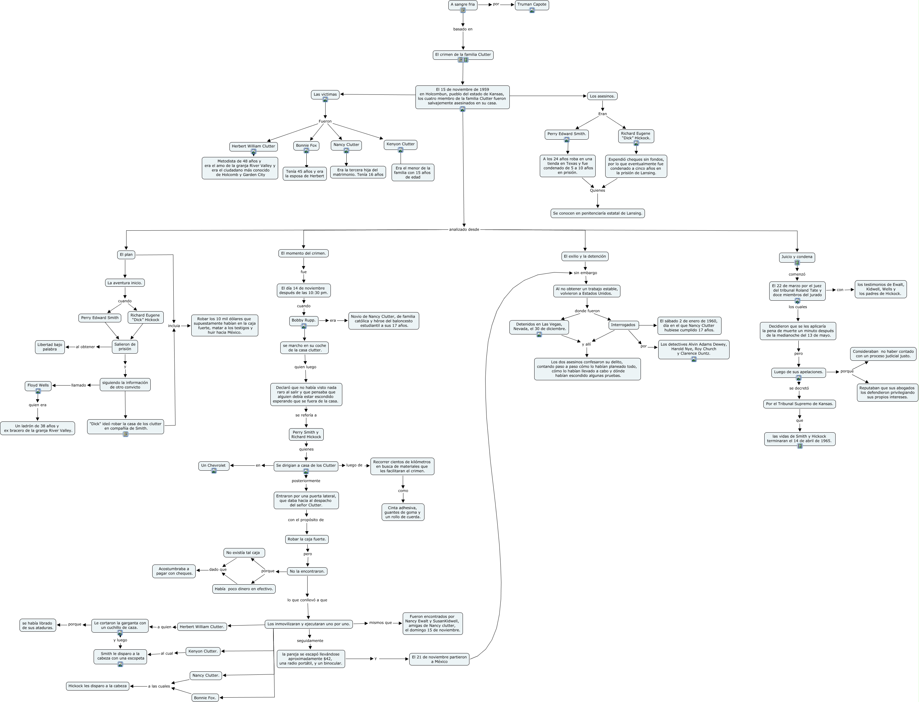 Este Cmap, tiene información relacionada con: Estructura del libro A SANGRE FRÍA de Truman Capote, Herbert William Clutter. a quien Le cortaron la garganta con un cuchillo de caza., A sangre fria basado en El crimen de la familia Clutter, Interrogados ???? El sábado 2 de enero de 1960, día en el que Nancy Clutter hubiese cumplido 17 años., "Dick" ideó robar la casa de los clutter en compañía de Smith. incluia Robar los 10 mil dólares que supuestamente habían en la caja fuerte, matar a los testigos y huir hacia México., Floyd Wells quien era Un ladrón de 38 años y ex bracero de la granja River Valley., siguiendo la información de otro convicto "dick" ideo "Dick" ideó robar la casa de los clutter en compañía de Smith., Las victimas Fueron Nancy Clutter, Las victimas Fueron Herbert William Clutter, El plan ???? La aventura inicio., La aventura inicio. cuando Richard Eugene “Dick” Hickock, Nancy Clutter. a las cuales Hickock les disparo a la cabeza, Le cortaron la garganta con un cuchillo de caza. porque se había librado de sus ataduras., Interrogados y allí Los dos asesinos confesaron su delito, contando paso a paso cómo lo habían planeado todo, cómo lo habían llevado a cabo y dónde habían escondido algunas pruebas., El 15 de noviembre de 1959 en Holcombun, pueblo del estado de Kansas, los cuatro miembro de la familia Clutter fueron salvajemente asesinados en su casa. analizado desde El momento del crimen., El 15 de noviembre de 1959 en Holcombun, pueblo del estado de Kansas, los cuatro miembro de la familia Clutter fueron salvajemente asesinados en su casa. analizado desde El plan, siguiendo la información de otro convicto llamado Floyd Wells, El momento del crimen. fue El día 14 de noviembre después de las 10:30 pm., Bonnie Fox ???? Tenía 45 años y era la esposa de Herbert, La aventura inicio. cuando Perry Edward Smith, Luego de sus apelaciones. porque Reputaban que sus abogados los defendieron privilegiando sus propios intereses.