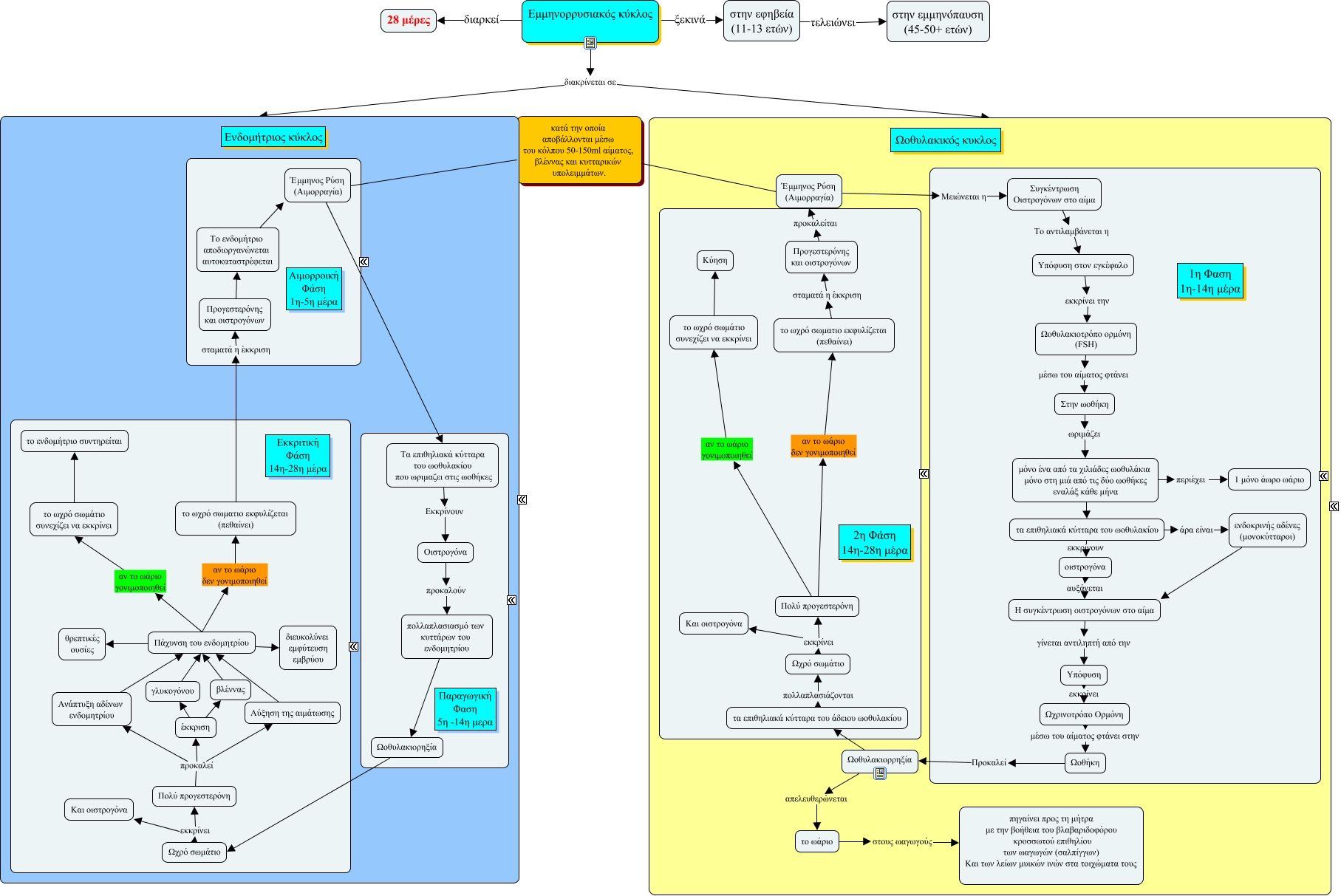 Αυτός ο εννοιολογικός χάρτης, που δημιουργήθηκε με το IHMC Cmap Tools, περιέχει πλήροφορίες που σχετίζονται με: Περίοδος, Υπόφυση εκκρίνει Ωχρινοτρόπο Ορμόνη, Εμμηνορρυσιακός κύκλος διαρκεί 28 μέρες, το ωχρό σωματιο εκφυλίζεται (πεθαίνει) σταματά η έκκριση Προγεστερόνης και οιστρογόνων, Ωοθυλακιοτρόπο ορμόνη (FSH) μέσω του αίματος φτάνει Στην ωοθήκη, το ωχρό σωμάτιο συνεχίζει να εκκρίνει Κύηση, βλέννας Πάχυνση του ενδομητρίου, κατά την οποία αποβάλλονται μέσω του κόλπου 50-150ml αίματος, βλέννας και κυτταρικών υπολειμμάτων. Έμμηνος Ρύση (Αιμορραγία), έκκριση βλέννας, έκκριση γλυκογόνου, Αύξηση της αιμάτωσης Πάχυνση του ενδομητρίου, Στην ωοθήκη ωριμάζει μόνο ένα από τα χιλιάδες ωοθυλάκια μόνο στη μιά από τις δύο ωοθήκες εναλάξ κάθε μήνα, Πάχυνση του ενδομητρίου αν το ωάριο γονιμοποιηθεί το ωχρό σωμάτιο συνεχίζει να εκκρίνει, Πολύ προγεστερόνη προκαλεί έκκριση, Συγκέντρωση Οιστρογόνων στο αίμα Το αντιλαμβάνεται η Υπόφυση στον εγκέφαλο, το ωχρό σωμάτιο συνεχίζει να εκκρίνει το ενδομήτριο συντηρείται, Πολύ προγεστερόνη προκαλεί Ανάπτυξη αδένων ενδομητρίου, Έμμηνος Ρύση (Αιμορραγία) Τα επιθηλιακά κύτταρα του ωοθυλακίου που ωριμαζει στις ωοθήκες, Τα επιθηλιακά κύτταρα του ωοθυλακίου που ωριμαζει στις ωοθήκες Εκκρίνουν Οιστρογόνα, τα επιθηλιακά κύτταρα του ωοθυλακίου άρα είναι ενδοκρινής αδένες (μονοκύτταροι), Ωχρό σωμάτιο εκκρίνει Πολύ προγεστερόνη