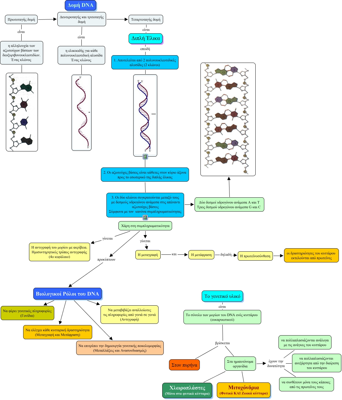 This Concept Map, created with IHMC CmapTools, has information related to: Δομή και ρόλος DNA, Χάρη στη συμπληρωματικότητα προκύπτουν Βιολογικοί Ρόλοι του DNA, Δευτεροταγής και τριτοταγής δομή είναι η ελικοειδής για κάθε πολυνουκλεοτιδική αλυσίδα Ένας κλώνος, Στα ημιαυτόνομα οργανίδια Χλωροπλάστες (Μόνο στα φυτικά κύτταρα), Χάρη στη συμπληρωματικότητα γίνεται Η αντιγραφή του μορίου με ακρίβεια. Ημισυντηρητικός τρόπος αντιγραφής (4ο κεφάλαιο), Το γενετικό υλικό είναι Το σύνολο των μορίων του DNA ενός κυττάρου (ευκαρυωτικού), 2. Οι αζωτούχες βάσεις είναι κάθετες στον κύριο άξονα προς το εσωτερικό της διπλής έλικας 3. Οι δύο κλώνοι συγκρατούνται μεταξύ τους με δεσμούς υδρογόνου ανάμεσα στις απέναντι αζωτούχες βάσεις Σύμφωνα με τον κανόνα συμπληρωματικότητας, Χάρη στη συμπληρωματικότητα γίνεται Η μεταγραφή, Στα ημιαυτόνομα οργανίδια έχουν την δυνατότητα να πολλαπλασιάζονται ανάλογα με τις ανάγκες του κυττάρου, ???? 2. Οι αζωτούχες βάσεις είναι κάθετες στον κύριο άξονα προς το εσωτερικό της διπλής έλικας, Πρωτοταγής δομή Δευτεροταγής και τριτοταγής δομή, Βιολογικοί Ρόλοι του DNA Να ελέγχει κάθε κυτταρική δραστηριότητα (Μεταγραφή και Μετάφραση), Στα ημιαυτόνομα οργανίδια έχουν την δυνατότητα να συνθέτουν μόνα τους κάποιες από τις πρωτεϊνες τους, 1. Αποτελείται από 2 πολυνουκλεοτιδικές αλυσίδες (2 κλώνοι), Στα ημιαυτόνομα οργανίδια Μιτοχόνδρια (Φυτικά ΚΑΙ Ζωικά κύτταρα), Η μετάφραση δηλαδή Η πρωτεϊνοσύνθεση, η ελικοειδής για κάθε πολυνουκλεοτιδική αλυσίδα Ένας κλώνος, Διπλή Έλικα επειδή 1. Αποτελείται από 2 πολυνουκλεοτιδικές αλυσίδες (2 κλώνοι), Βιολογικοί Ρόλοι του DNA Να επιτρέπει την δημιουργία γενετικής ποικιλομορφίας (Μεταλλάξεις και Ανασυνδυασμός), Τεταρτοταγής δομή είναι Διπλή Έλικα, Πρωτοταγής δομή είναι η αλληλουχία των αζωτούχων βάσεων των δεοξυριβονουκλεοτιδίων. Ένας κλώνος