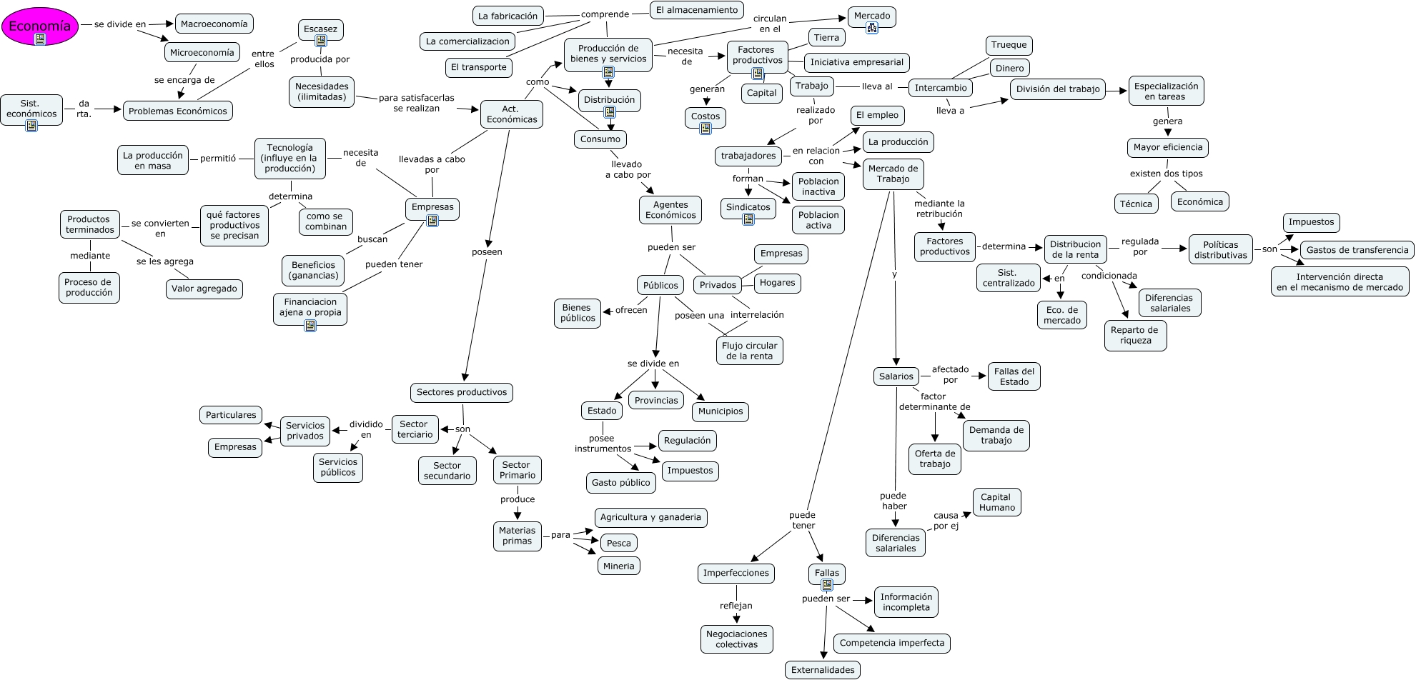 Este Cmap, tiene información relacionada con: Economia, Intercambio ???? Dinero, Factores productivos ???? Trabajo, División del trabajo ???? Especialización en tareas, Privados ???? Empresas, Sectores productivos son Sector secundario, Mayor eficiencia existen dos tipos Económica, Distribución relaciona Producción de bienes y servicios, Tecnología (influye en la producción) determina qué factores productivos se precisan, Políticas distributivas son Gastos de transferencia, trabajadores forman Poblacion activa, Mayor eficiencia existen dos tipos Técnica, Act. Económicas como Consumo, Materias primas para Agricultura y ganaderia, Productos terminados se les agrega Valor agregado, Privados interrelación Flujo circular de la renta, Act. Económicas como Producción de bienes y servicios, Especialización en tareas genera Mayor eficiencia, Públicos se divide en Municipios, Políticas distributivas son Impuestos, Sectores productivos son Sector terciario