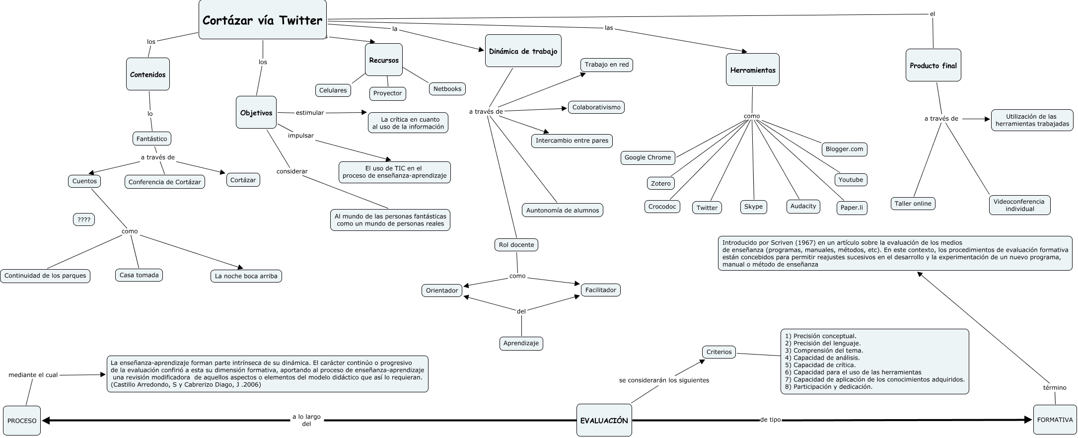 Este Cmap, tiene información relacionada con: Ricardo_USAL, Cortázar vía Twitter los Objetivos, Criterios ???? 1) Precisión conceptual. 2) Precisión del lenguaje. 3) Comprensión del tema. 4) Capacidad de análisis. 5) Capacidad de crítica. 6) Capacidad para el uso de las herramientas 7) Capacidad de aplicación de los conocimientos adquiridos. 8) Participación y dedicación., EVALUACIÓN se considerarán los siguientes Criterios, Producto final a través de Videoconferencia individual, Rol docente como Facilitador, Fantástico a través de Cortázar, Herramientas como Skype, Fantástico a través de Cuentos, Dinámica de trabajo a través de Rol docente, EVALUACIÓN a lo largo del PROCESO, Aprendizaje del Facilitador, Herramientas como Google Chrome, Herramientas como Crocodoc, Objetivos estimular La crítica en cuanto al uso de la información, Fantástico a través de Conferencia de Cortázar, Aprendizaje del Orientador, Herramientas como Audacity, Herramientas como Blogger.com, Dinámica de trabajo a través de Trabajo en red, Producto final a través de Utilización de las herramientas trabajadas