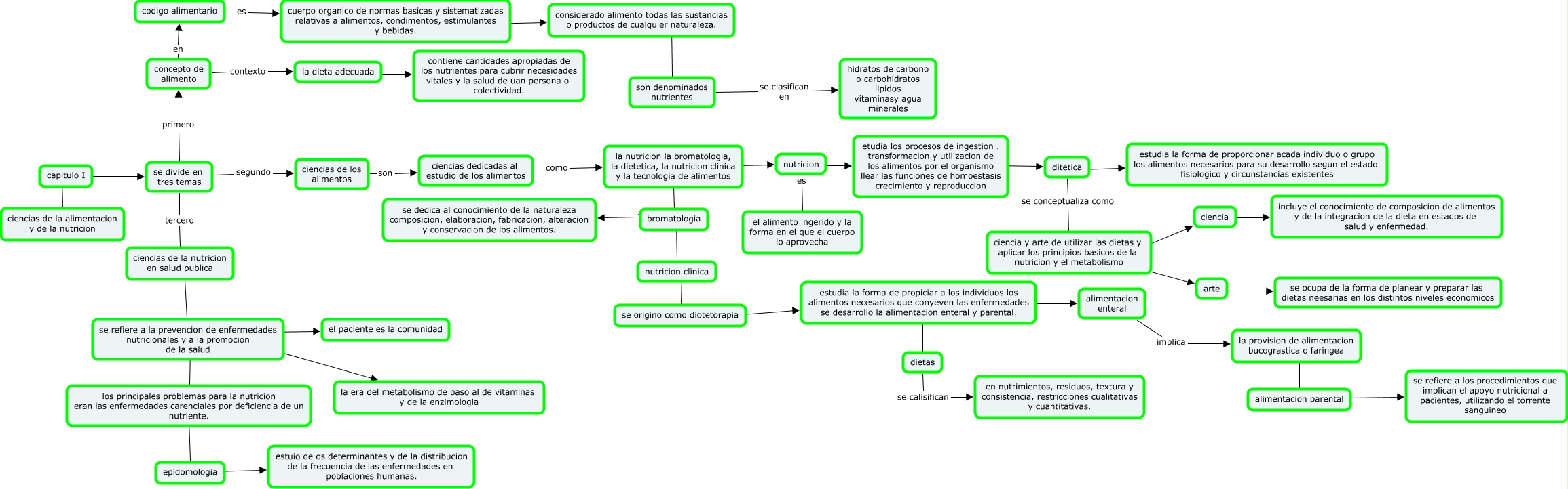 Este Cmap, tiene información relacionada con: capitulo I, ciencias de los alimentos son ciencias dedicadas al estudio de los alimentos, los principales problemas para la nutricion eran las enfermedades carenciales por deficiencia de un nutriente. ???? epidomologia, la nutricion la bromatologia, la dietetica, la nutricion clinica y la tecnologia de alimentos ???? bromatologia, ciencias dedicadas al estudio de los alimentos como la nutricion la bromatologia, la dietetica, la nutricion clinica y la tecnologia de alimentos, epidomologia ???? estuio de os determinantes y de la distribucion de la frecuencia de las enfermedades en poblaciones humanas., nutricion es el alimento ingerido y la forma en el que el cuerpo lo aprovecha, etudia los procesos de ingestion . transformacion y utilizacion de los alimentos por el organismo llear las funciones de homoestasis crecimiento y reproduccion ???? ditetica, ditetica ???? estudia la forma de proporcionar acada individuo o grupo los alimentos necesarios para su desarrollo segun el estado fisiologico y circunstancias existentes, nutricion clinica ???? se origino como diotetorapia, se divide en tres temas segundo ciencias de los alimentos, la nutricion la bromatologia, la dietetica, la nutricion clinica y la tecnologia de alimentos ???? nutricion, bromatologia ???? nutricion clinica, considerado alimento todas las sustancias o productos de cualquier naturaleza. ???? son denominados nutrientes, dietas se calisifican en nutrimientos, residuos, textura y consistencia, restricciones cualitativas y cuantitativas., concepto de alimento en codigo alimentario, se refiere a la prevencion de enfermedades nutricionales y a la promocion de la salud ???? el paciente es la comunidad, cuerpo organico de normas basicas y sistematizadas relativas a alimentos, condimentos, estimulantes y bebidas. ???? considerado alimento todas las sustancias o productos de cualquier naturaleza., ciencia ???? incluye el conocimiento de composicion de alimentos y de la integracion de la dieta en estados de salud y enfermedad., capitulo I ???? se divide en tres temas, la provision de alimentacion bucograstica o faringea ???? alimentacion parental