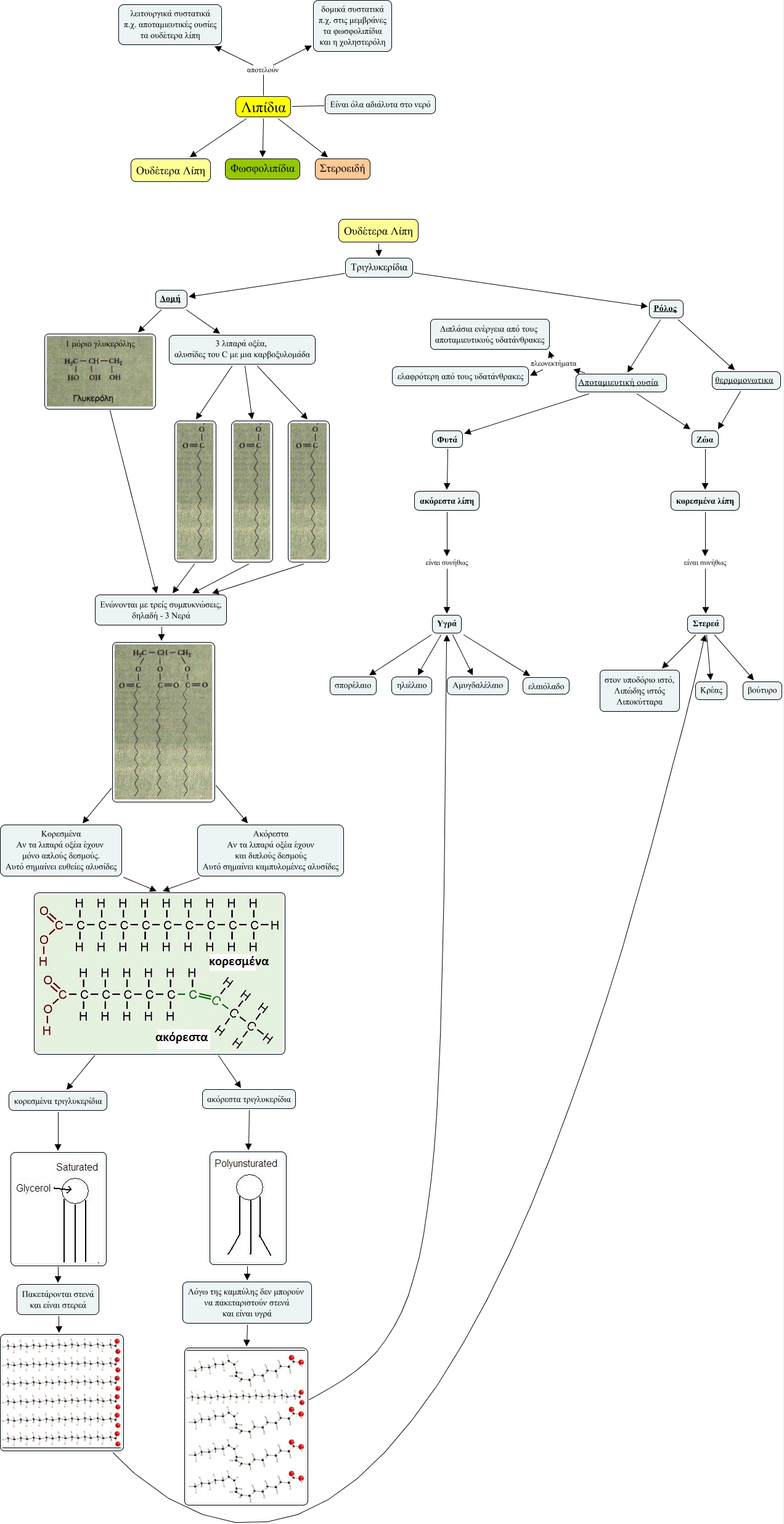 This Concept Map, created with IHMC CmapTools, has information related to: Λιπίδια-Ουδέτερα Λίπη, Πακετάρονται στενά και είναι στερεά, Στερεά Κρέας, Υγρά ελαιόλαδο, Αποταμιευτική ουσία πλεονεκτήματα Διπλάσια ενέργεια από τους αποταμιευτικούς υδατάνθρακες, Ενώνονται με τρείς συμπυκνώσεις, δηλαδή - 3 Νερά, Υγρά, Λόγω της καμπύλης δεν μπορούν να πακεταριστούν στενά και είναι υγρά, 3 λιπαρά οξέα, αλυσίδες του C με μια καρβοξυλομάδα, Λόγω της καμπύλης δεν μπορούν να πακεταριστούν στενά και είναι υγρά, ακόρεστα λίπη είναι συνήθως Υγρά, Τριγλυκερίδια Ρόλος, ακόρεστα τριγλυκερίδια, Δομή 1 μόριο γλυκερόλης, Λιπίδια Είναι όλα αδιάλυτα στο νερό, Στερεά, Φυτά ακόρεστα λίπη, Αποταμιευτική ουσία πλεονεκτήματα ελαφρότερη από τους υδατάνθρακες, Ενώνονται με τρείς συμπυκνώσεις, δηλαδή - 3 Νερά, Στερεά στον υποδόριο ιστό, Λιπώδης ιστός Λιποκύτταρα, 3 λιπαρά οξέα, αλυσίδες του C με μια καρβοξυλομάδα