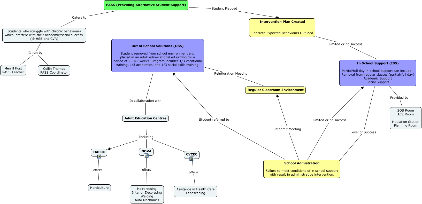 This Concept Map, created with IHMC CmapTools, has information related to: PASS, In School Support (ISS) Partial/full day in-school support can include: Removal from regular classes (partial/full day) Academic Support Social Support Level of Success School Admistration Failure to meet conditions of in school support with result in administrative intervention., HAECC offers Horticulture, Adult Education Centres Including NOVA, Out of School Solutions (OSS) Student removed from school environment and placed in an adult ed/vocational ed setting for a period of 2 - 4+ weeks. Program includes 1/3 vocational training, 1/3 academics, and 1/3 social skills training. Reintigration Meeting Regular Classroom Environment, School Admistration Failure to meet conditions of in school support with result in administrative intervention. Limited or no success In School Support (ISS) Partial/full day in-school support can include: Removal from regular classes (partial/full day) Academic Support Social Support, Adult Education Centres Including CVCEC, Intervention Plan Created Concrete Expected Behaviours Outlined Limited or no success In School Support (ISS) Partial/full day in-school support can include: Removal from regular classes (partial/full day) Academic Support Social Support, CVCEC offers Assitance in Health Care Landscaping, School Admistration Failure to meet conditions of in school support with result in administrative intervention. Readmit Meeting Regular Classroom Environment, Out of School Solutions (OSS) Student removed from school environment and placed in an adult ed/vocational ed setting for a period of 2 - 4+ weeks. Program includes 1/3 vocational training, 1/3 academics, and 1/3 social skills training. In collaboration with Adult Education Centres, Adult Education Centres Including HAECC, Students who struggle with chronic behaviours which interfere with their academic/social success. (@ HSB and CVR) Is run by Merrill Kost PASS Teacher, NOVA offers Hairdressing Interior Decorating Welding Auto Mechanics, In School Support (ISS) Partial/full day in-school support can include: Removal from regular classes (partial/full day) Academic Support Social Support Provided by SOS Room ACE Room Mediation Station Planning Room, PASS (Providing Alternative Student Support) Caters to Students who struggle with chronic behaviours which interfere with their academic/social success. (@ HSB and CVR), PASS (Providing Alternative Student Support) Student Flagged Intervention Plan Created Concrete Expected Behaviours Outlined, Students who struggle with chronic behaviours which interfere with their academic/social success. (@ HSB and CVR) Is run by Collin Thomas PASS Coordinator, School Admistration Failure to meet conditions of in school support with result in administrative intervention. Student referred to Out of School Solutions (OSS) Student removed from school environment and placed in an adult ed/vocational ed setting for a period of 2 - 4+ weeks. Program includes 1/3 vocational training, 1/3 academics, and 1/3 social skills training.