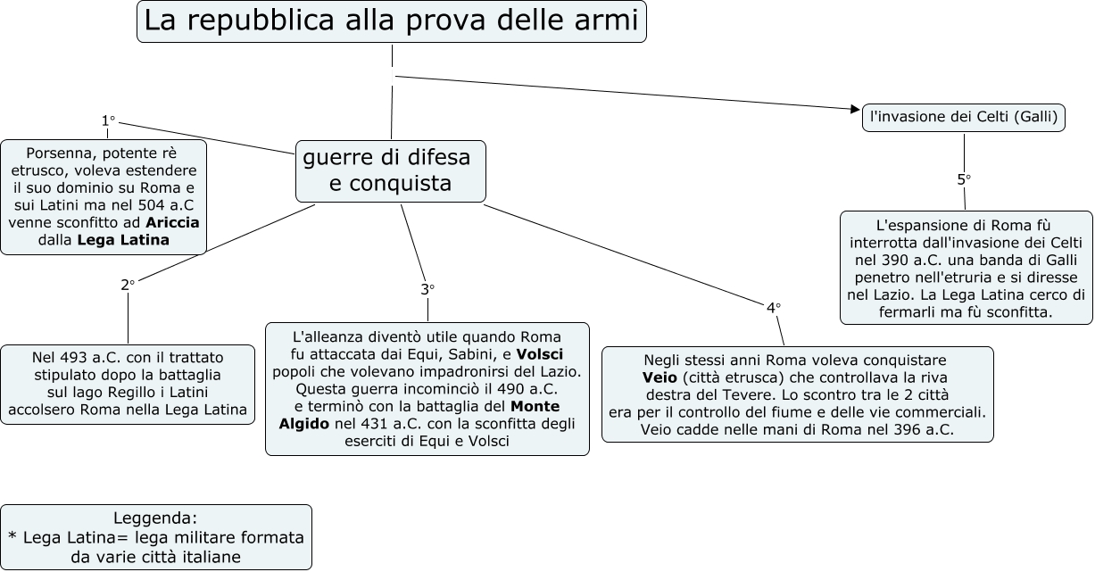 Questa Cmap, creata con IHMC CmapTools, contiene informazioni relative a: La repubblica alla prova delle armi, guerre di difesa e conquista 4° Negli stessi anni Roma voleva conquistare Veio (città etrusca) che controllava la riva destra del Tevere. Lo scontro tra le 2 città era per il controllo del fiume e delle vie commerciali. Veio cadde nelle mani di Roma nel 396 a.C., l'invasione dei Celti (Galli) 5° L'espansione di Roma fù interrotta dall'invasione dei Celti nel 390 a.C. una banda di Galli penetro nell'etruria e si diresse nel Lazio. La Lega Latina cerco di fermarli ma fù sconfitta., guerre di difesa e conquista 3° L'alleanza diventò utile quando Roma fu attaccata dai Equi, Sabini, e Volsci popoli che volevano impadronirsi del Lazio. Questa guerra incominciò il 490 a.C. e terminò con la battaglia del Monte Algido nel 431 a.C. con la sconfitta degli eserciti di Equi e Volsci, La repubblica alla prova delle armi l'invasione dei Celti (Galli), guerre di difesa e conquista 1° Porsenna, potente rè etrusco, voleva estendere il suo dominio su Roma e sui Latini ma nel 504 a.C venne sconfitto ad Ariccia dalla Lega Latina, La repubblica alla prova delle armi guerre di difesa e conquista, guerre di difesa e conquista 2° Nel 493 a.C. con il trattato stipulato dopo la battaglia sul lago Regillo i Latini accolsero Roma nella Lega Latina