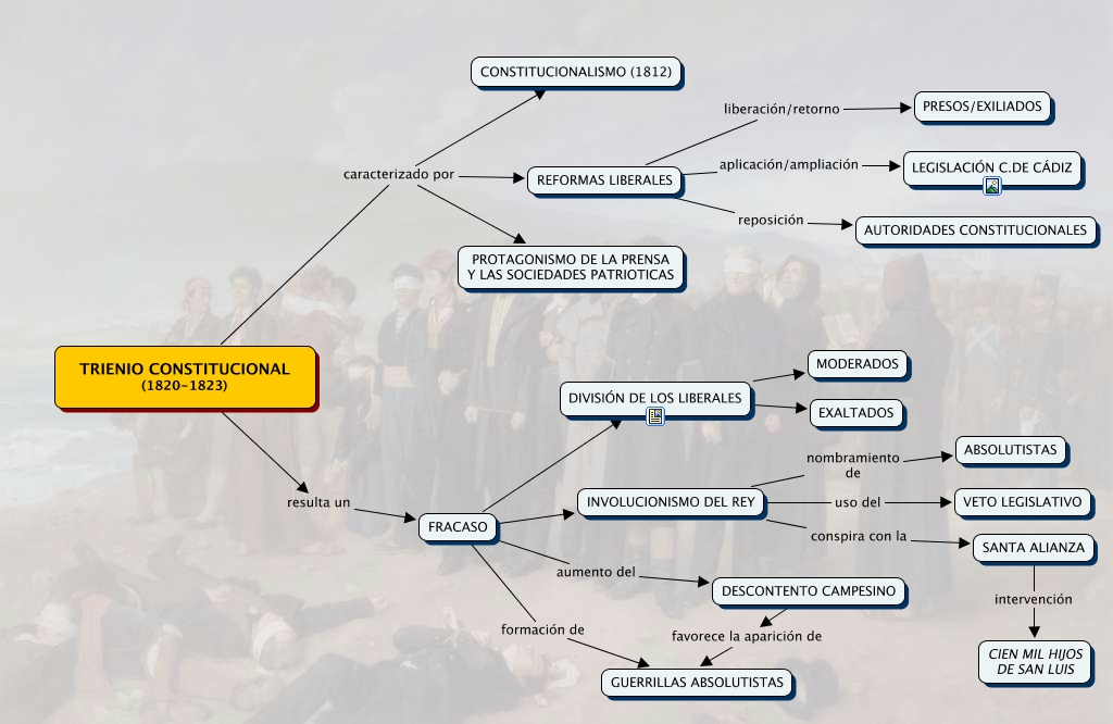 Este Cmap, tiene información relacionada con: Trienio constitucional, FRACASO INVOLUCIONISMO DEL REY, TRIENIO CONSTITUCIONAL (1820-1823) resulta un FRACASO, INVOLUCIONISMO DEL REY nombramiento de ABSOLUTISTAS, INVOLUCIONISMO DEL REY uso del VETO LEGISLATIVO, REFORMAS LIBERALES reposición AUTORIDADES CONSTITUCIONALES, TRIENIO CONSTITUCIONAL (1820-1823) caracterizado por CONSTITUCIONALISMO (1812), FRACASO formación de GUERRILLAS ABSOLUTISTAS, TRIENIO CONSTITUCIONAL (1820-1823) caracterizado por REFORMAS LIBERALES, DESCONTENTO CAMPESINO favorece la aparición de GUERRILLAS ABSOLUTISTAS, INVOLUCIONISMO DEL REY conspira con la SANTA ALIANZA, SANTA ALIANZA intervención CIEN MIL HIJOS DE SAN LUIS, FRACASO aumento del DESCONTENTO CAMPESINO, REFORMAS LIBERALES liberación/retorno PRESOS/EXILIADOS, TRIENIO CONSTITUCIONAL (1820-1823) caracterizado por PROTAGONISMO DE LA PRENSA Y LAS SOCIEDADES PATRIOTICAS, FRACASO DIVISIÓN DE LOS LIBERALES, DIVISIÓN DE LOS LIBERALES EXALTADOS, DIVISIÓN DE LOS LIBERALES MODERADOS, REFORMAS LIBERALES aplicación/ampliación LEGISLACIÓN C.DE CÁDIZ