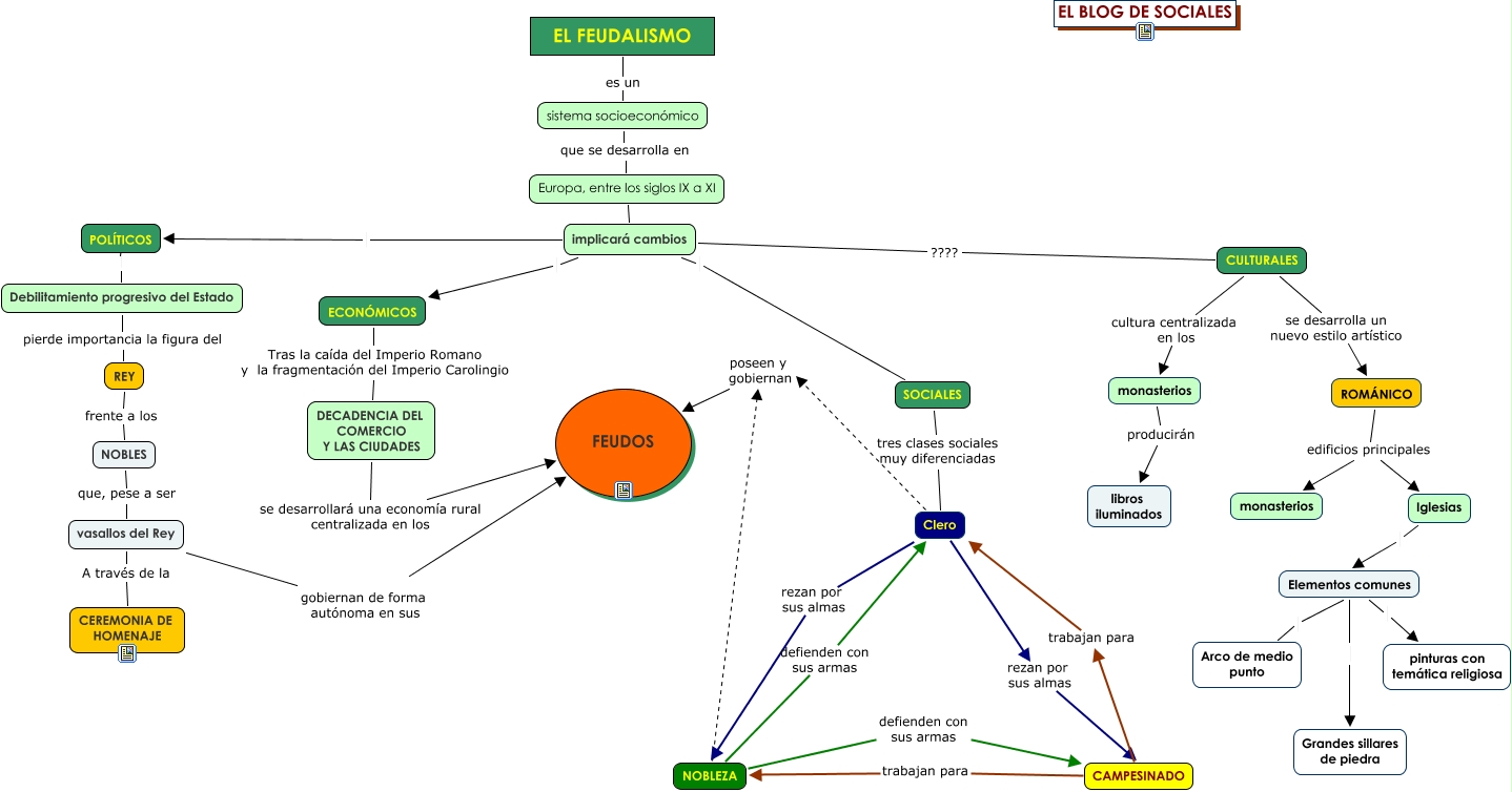 Este Cmap, tiene información relacionada con: feudalismo, vasallos del Rey gobiernan de forma autónoma en sus FEUDOS, CAMPESINADO trabajan para Clero, ROMÁNICO edificios principales Iglesias, Elementos comunes Arco de medio punto, implicará cambios ECONÓMICOS, DECADENCIA DEL COMERCIO Y LAS CIUDADES se desarrollará una economía rural centralizada en los FEUDOS, EL FEUDALISMO es un sistema socioeconómico, implicará cambios POLÍTICOS, CULTURALES cultura centralizada en los monasterios, CULTURALES ???? implicará cambios, SOCIALES tres clases sociales muy diferenciadas Clero, ROMÁNICO edificios principales monasterios, Elementos comunes Grandes sillares de piedra, NOBLEZA defienden con sus armas Clero, CAMPESINADO trabajan para NOBLEZA, ECONÓMICOS Tras la caída del Imperio Romano y la fragmentación del Imperio Carolingio DECADENCIA DEL COMERCIO Y LAS CIUDADES, Elementos comunes pinturas con temática religiosa, Iglesias Elementos comunes, monasterios producirán libros iluminados, Clero rezan por sus almas NOBLEZA