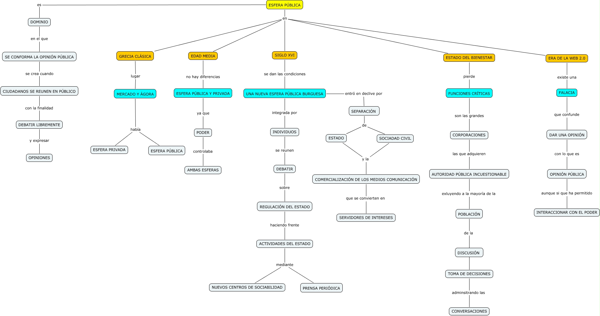 Este Cmap, tiene información relacionada con: Esfera Pública, ERA DE LA WEB 2.0 existe una FALACIA, SEPARACIÓN de ESTADO, POBLACIÓN de la DISCUSIÓN, TOMA DE DECISIONES adminsitrando las CONVERSACIONES, UNA NUEVA ESFERA PÚBLICA BURGUESA integrada por INDIVIDUOS, ESTADO y la COMERCIALIZACIÓN DE LOS MEDIOS COMUNICACIÓN, ESTADO DEL BIENESTAR en SIGLO XVI, ESFERA PÚBLICA Y PRIVADA ya que PODER, ESFERA PÚBLICA en SIGLO XVI, UNA NUEVA ESFERA PÚBLICA BURGUESA entró en declive por SEPARACIÓN, DOMINIO en el que SE CONFORMA LA OPINIÓN PÚBLICA, MERCADO Y ÁGORA había ESFERA PÚBLICA, FUNCIONES CRÍTICAS son las grandes CORPORACIONES, SE CONFORMA LA OPINIÓN PÚBLICA se crea cuando CIUDADANOS SE REUNEN EN PÚBLICO, DEBATIR LIBREMENTE y expresar OPINIONES, GRECIA CLÁSICA en SIGLO XVI, SOCIADAD CIVIL y la COMERCIALIZACIÓN DE LOS MEDIOS COMUNICACIÓN, GRECIA CLÁSICA lugar MERCADO Y ÁGORA, ESTADO DEL BIENESTAR en EDAD MEDIA, POBLACIÓN de la TOMA DE DECISIONES
