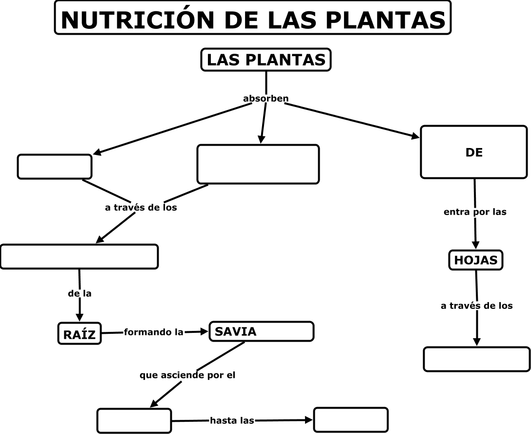 Este Cmap, tiene información relacionada con: nutrición plantas incompleto, DE entra por las HOJAS, a través de los, hasta las, RAÍZ formando la SAVIA, LAS PLANTAS absorben, de la RAÍZ, a través de los, SAVIA que asciende por el, LAS PLANTAS absorben, HOJAS a través de los, LAS PLANTAS absorben DE
