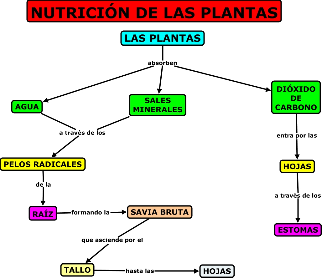 Este Cmap, tiene información relacionada con: nutrición plantas, DIÓXIDO DE CARBONO entra por las HOJAS, AGUA a través de los PELOS RADICALES, TALLO hasta las HOJAS, RAÍZ formando la SAVIA BRUTA, LAS PLANTAS absorben AGUA, PELOS RADICALES de la RAÍZ, SALES MINERALES a través de los PELOS RADICALES, SAVIA BRUTA que asciende por el TALLO, LAS PLANTAS absorben SALES MINERALES, HOJAS a través de los ESTOMAS, LAS PLANTAS absorben DIÓXIDO DE CARBONO