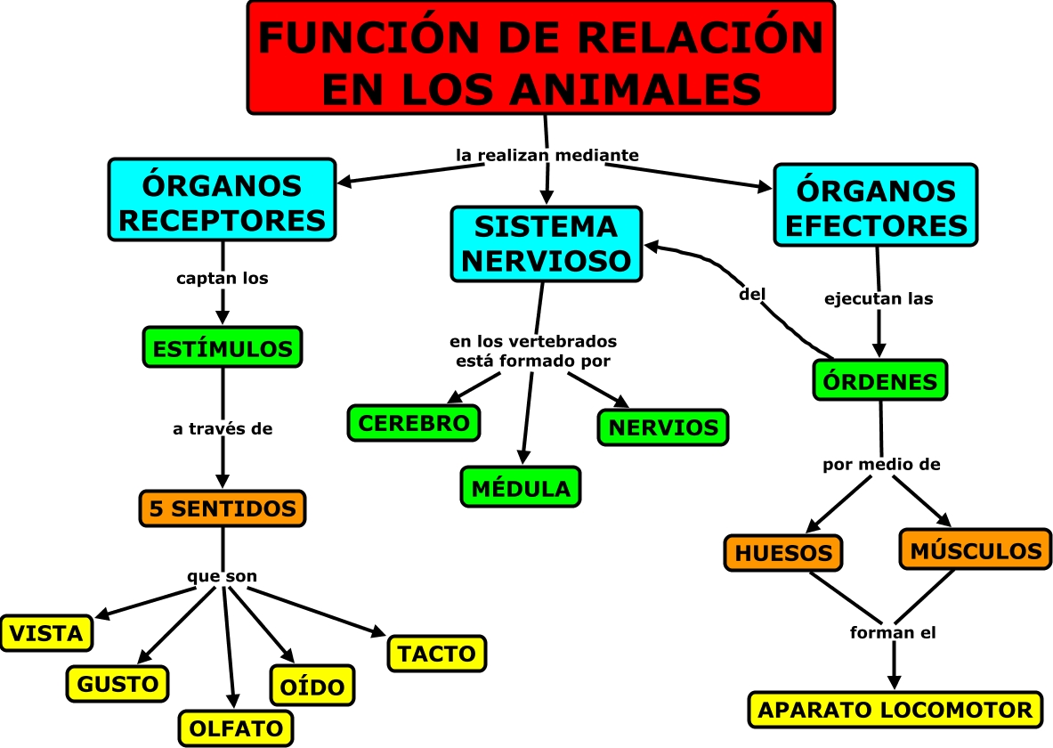 Este Cmap, tiene información relacionada con: función de relación, 5 SENTIDOS que son TACTO, HUESOS forman el APARATO LOCOMOTOR, SISTEMA NERVIOSO en los vertebrados está formado por CEREBRO, FUNCIÓN DE RELACIÓN EN LOS ANIMALES la realizan mediante SISTEMA NERVIOSO, FUNCIÓN DE RELACIÓN EN LOS ANIMALES la realizan mediante ÓRGANOS RECEPTORES, ÓRGANOS RECEPTORES captan los ESTÍMULOS, ÓRGANOS EFECTORES ejecutan las ÓRDENES, ESTÍMULOS a través de 5 SENTIDOS, SISTEMA NERVIOSO en los vertebrados está formado por NERVIOS, 5 SENTIDOS que son OLFATO, FUNCIÓN DE RELACIÓN EN LOS ANIMALES la realizan mediante ÓRGANOS EFECTORES, ÓRDENES del SISTEMA NERVIOSO, MÚSCULOS forman el APARATO LOCOMOTOR, 5 SENTIDOS que son VISTA, ÓRDENES por medio de MÚSCULOS, 5 SENTIDOS que son GUSTO, ÓRDENES por medio de HUESOS, 5 SENTIDOS que son OÍDO, SISTEMA NERVIOSO en los vertebrados está formado por MÉDULA
