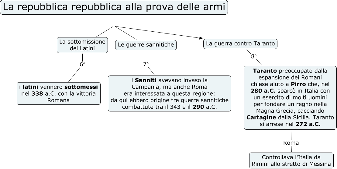 Questa Cmap, creata con IHMC CmapTools, contiene informazioni relative a: La repubblica alla prova delle armi (parte 2), La guerra contro Taranto 8° Taranto preoccupato dalla espansione dei Romani chiese aiuto a Pirro che, nel 280 a.C. sbarcò in Italia con un esercito di molti uomini per fondare un regno nella Magna Grecia, cacciando Cartagine dalla Sicilia. Taranto si arrese nel 272 a.C., La repubblica repubblica alla prova delle armi La sottomissione dei Latini, La sottomissione dei Latini 6° i latini vennero sottomessi nel 338 a.C. con la vittoria Romana, La repubblica repubblica alla prova delle armi La guerra contro Taranto, La repubblica repubblica alla prova delle armi Le guerre sannitiche, Taranto preoccupato dalla espansione dei Romani chiese aiuto a Pirro che, nel 280 a.C. sbarcò in Italia con un esercito di molti uomini per fondare un regno nella Magna Grecia, cacciando Cartagine dalla Sicilia. Taranto si arrese nel 272 a.C. Roma Controllava l'Italia da Rimini allo stretto di Messina, Le guerre sannitiche 7° i Sanniti avevano invaso la Campania, ma anche Roma era interessata a questa regione: da qui ebbero origine tre guerre sannitiche combattute tra il 343 e il 290 a.C.