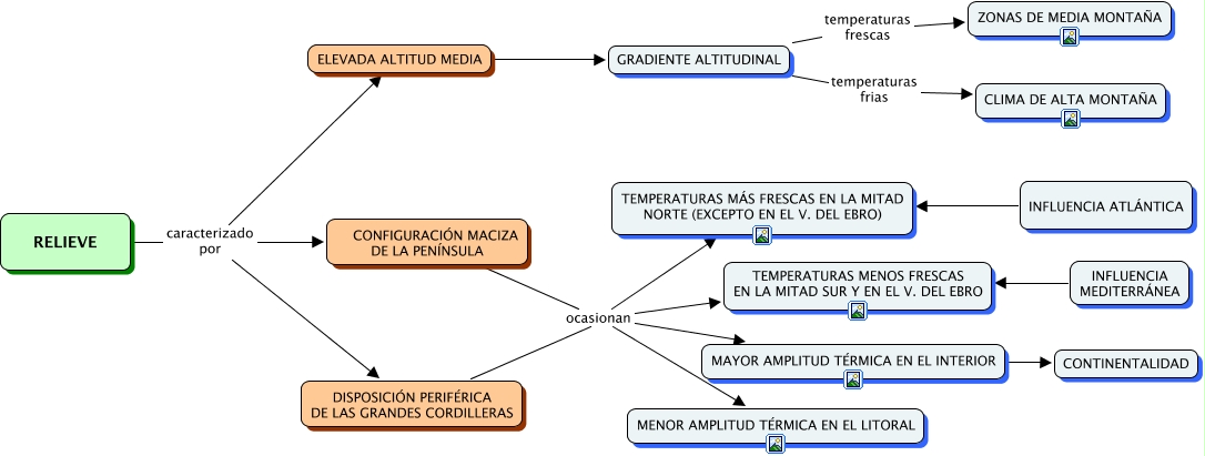 Este Cmap, tiene información relacionada con: Relación relieve-temperaturas, INFLUENCIA MEDITERRÁNEA TEMPERATURAS MENOS FRESCAS EN LA MITAD SUR Y EN EL V. DEL EBRO, DISPOSICIÓN PERIFÉRICA DE LAS GRANDES CORDILLERAS ocasionan MENOR AMPLITUD TÉRMICA EN EL LITORAL, CONFIGURACIÓN MACIZA DE LA PENÍNSULA ocasionan TEMPERATURAS MÁS FRESCAS EN LA MITAD NORTE (EXCEPTO EN EL V. DEL EBRO), RELIEVE caracterizado por DISPOSICIÓN PERIFÉRICA DE LAS GRANDES CORDILLERAS, GRADIENTE ALTITUDINAL temperaturas frias CLIMA DE ALTA MONTAÑA, ELEVADA ALTITUD MEDIA GRADIENTE ALTITUDINAL, CONFIGURACIÓN MACIZA DE LA PENÍNSULA ocasionan MAYOR AMPLITUD TÉRMICA EN EL INTERIOR, GRADIENTE ALTITUDINAL temperaturas frescas ZONAS DE MEDIA MONTAÑA, RELIEVE caracterizado por ELEVADA ALTITUD MEDIA, DISPOSICIÓN PERIFÉRICA DE LAS GRANDES CORDILLERAS ocasionan MAYOR AMPLITUD TÉRMICA EN EL INTERIOR, CONFIGURACIÓN MACIZA DE LA PENÍNSULA ocasionan MENOR AMPLITUD TÉRMICA EN EL LITORAL, DISPOSICIÓN PERIFÉRICA DE LAS GRANDES CORDILLERAS ocasionan TEMPERATURAS MÁS FRESCAS EN LA MITAD NORTE (EXCEPTO EN EL V. DEL EBRO), DISPOSICIÓN PERIFÉRICA DE LAS GRANDES CORDILLERAS ocasionan TEMPERATURAS MENOS FRESCAS EN LA MITAD SUR Y EN EL V. DEL EBRO, MAYOR AMPLITUD TÉRMICA EN EL INTERIOR CONTINENTALIDAD, INFLUENCIA ATLÁNTICA TEMPERATURAS MÁS FRESCAS EN LA MITAD NORTE (EXCEPTO EN EL V. DEL EBRO), RELIEVE caracterizado por CONFIGURACIÓN MACIZA DE LA PENÍNSULA, CONFIGURACIÓN MACIZA DE LA PENÍNSULA ocasionan TEMPERATURAS MENOS FRESCAS EN LA MITAD SUR Y EN EL V. DEL EBRO