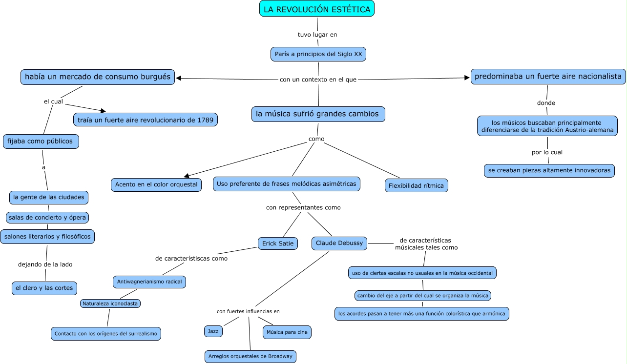 Este Cmap, tiene información relacionada con: Conexión Francesa, la gente de las ciudades salas de concierto y ópera salones literarios y filosóficos, Uso preferente de frases melódicas asimétricas con representantes como Claude Debussy, predominaba un fuerte aire nacionalista donde los músicos buscaban principalmente diferenciarse de la tradición Austrio-alemana, la música sufrió grandes cambios como Uso preferente de frases melódicas asimétricas, había un mercado de consumo burgués el cual traía un fuerte aire revolucionario de 1789, Erick Satie de característiscas como Antiwagnerianismo radical, la música sufrió grandes cambios como Acento en el color orquestal, París a principios del Siglo XX con un contexto en el que predominaba un fuerte aire nacionalista, Antiwagnerianismo radical Naturaleza iconoclasta Contacto con los orígenes del surrealismo, París a principios del Siglo XX con un contexto en el que había un mercado de consumo burgués, Claude Debussy con fuertes influencias en Música para cine, los músicos buscaban principalmente diferenciarse de la tradición Austrio-alemana por lo cual se creaban piezas altamente innovadoras, LA REVOLUCIÓN ESTÉTICA tuvo lugar en París a principios del Siglo XX, Claude Debussy con fuertes influencias en Arreglos orquestales de Broadway, la música sufrió grandes cambios como Flexibilidad rítmica, Claude Debussy de características músicales tales como uso de ciertas escalas no usuales en la música occidental, fijaba como públicos a la gente de las ciudades, París a principios del Siglo XX con un contexto en el que la música sufrió grandes cambios, Claude Debussy con fuertes influencias en Jazz, había un mercado de consumo burgués el cual fijaba como públicos
