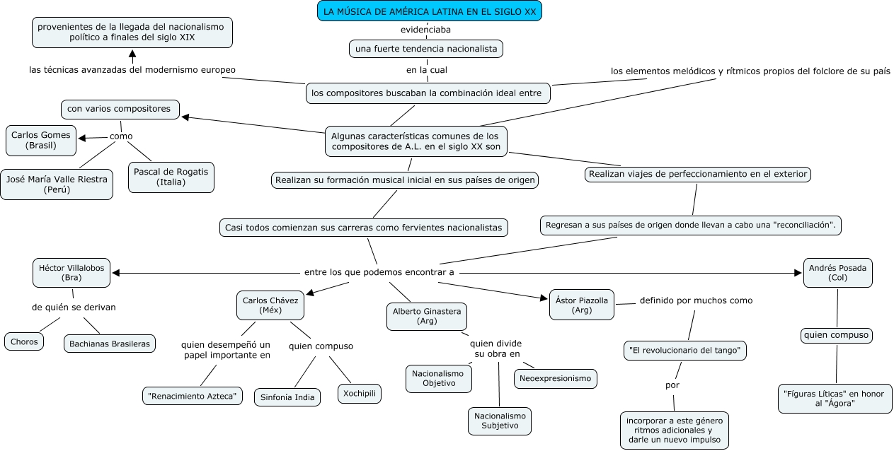 Este Cmap, tiene información relacionada con: América Latina, Algunas características comunes de los compositores de A.L. en el siglo XX son Realizan su formación musical inicial en sus países de origen Casi todos comienzan sus carreras como fervientes nacionalistas, Regresan a sus países de origen donde llevan a cabo una "reconciliación". entre los que podemos encontrar a Ástor Piazolla (Arg), Casi todos comienzan sus carreras como fervientes nacionalistas entre los que podemos encontrar a Carlos Chávez (Méx), Regresan a sus países de origen donde llevan a cabo una "reconciliación". entre los que podemos encontrar a Carlos Chávez (Méx), con varios compositores como Pascal de Rogatis (Italia), Héctor Villalobos (Bra) de quién se derivan Bachianas Brasileras, Andrés Posada (Col) quien compuso "Fíguras Líticas" en honor al "Ágora", Ástor Piazolla (Arg) definido por muchos como "El revolucionario del tango", "El revolucionario del tango" por incorporar a este género ritmos adicionales y darle un nuevo impulso, Héctor Villalobos (Bra) de quién se derivan Choros, con varios compositores como José María Valle Riestra (Perú), Casi todos comienzan sus carreras como fervientes nacionalistas entre los que podemos encontrar a Héctor Villalobos (Bra), Alberto Ginastera (Arg) quien divide su obra en Nacionalismo Objetivo, Algunas características comunes de los compositores de A.L. en el siglo XX son Realizan viajes de perfeccionamiento en el exterior Regresan a sus países de origen donde llevan a cabo una "reconciliación"., Regresan a sus países de origen donde llevan a cabo una "reconciliación". entre los que podemos encontrar a Héctor Villalobos (Bra), Carlos Chávez (Méx) quien desempeñó un papel importante en "Renacimiento Azteca", Casi todos comienzan sus carreras como fervientes nacionalistas entre los que podemos encontrar a Andrés Posada (Col), los compositores buscaban la combinación ideal entre los elementos melódicos y rítmicos propios del folclore de su país ????, los compositores buscaban la combinación ideal entre ???? con varios compositores, Regresan a sus países de origen donde llevan a cabo una "reconciliación". entre los que podemos encontrar a Andrés Posada (Col)
