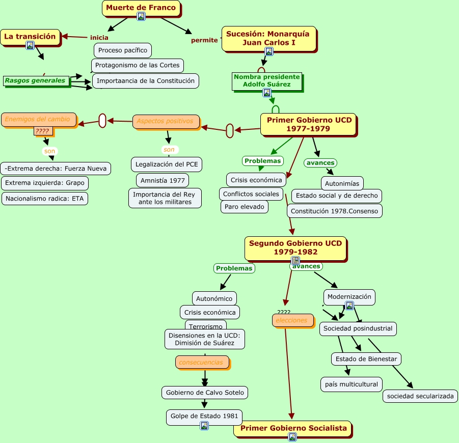 Este Cmap, tiene información relacionada con: mapa conceptual, Segundo Gobierno UCD 1979-1982 avances Modernización, Segundo Gobierno UCD 1979-1982 Problemas Autonómico, Muerte de Franco inicia La transición, Primer Gobierno UCD 1977-1979 Aspectos positivos, Aspectos positivos Enemigos del cambio, Segundo Gobierno UCD 1979-1982 ???? Primer Gobierno Socialista, Disensiones en la UCD: Dimisión de Suárez Gobierno de Calvo Sotelo, Modernización Sociedad posindustrial, Primer Gobierno UCD 1977-1979 avances Autonimías, Modernización Estado de Bienestar, La transición Rasgos generales, Primer Gobierno UCD 1977-1979 Problemas Crisis económica, Rasgos generales Protagonismo de las Cortes, Aspectos positivos son Legalización del PCE, Modernización país multicultural, Primer Gobierno UCD 1977-1979 Segundo Gobierno UCD 1979-1982, Enemigos del cambio son -Extrema derecha: Fuerza Nueva, Sucesión: Monarquía Juan Carlos I Nombra presidente Adolfo Suárez, Muerte de Franco permite Sucesión: Monarquía Juan Carlos I, Gobierno de Calvo Sotelo Golpe de Estado 1981