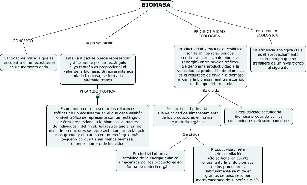Este Cmap, tiene información relacionada con: BIOMASA, Esta cantidad se puede representar gráficamente por un rectángulo cuyo tamaño es proporcional al valor de la biomasa. Si representamos toda la biomasa, se forma la pirámide trófica PIRAMIDE TROFICA Es un modo de representar las relaciones tróficas de un ecosistema en el que cada eslabón o nivel trófico se representa con un rectángulo de área proporcional a la biomasa, al número de individuos… del nivel. Así resulta que el primer nivel de productores se representa con un rectángulo más grande y el último con un rectángulo más pequeño porque tienen menos biomasa, o menor número de individuo., BIOMASA CONCEPTO Cantidad de materia que se encuentra en un ecosistema en un momento dado., BIOMASA EFICIENCIA ECOLOGICA La eficiencia ecológica (EE) es el aprovechamiento de la energía que se transfiere de un nivel trófico al siguiente, BIOMASA PRODUCTIVIDAD ECOLOGICA Productividad y eficiencia ecológica son términos relacionados con la transferencia de biomasa (energía) entre niveles tróficos. Se denomina productividad a la velocidad de producción de biomasa, es el resultado de dividir la biomasa inicial y la biomasa final transcurrido un tiempo determinado, Productividad y eficiencia ecológica son términos relacionados con la transferencia de biomasa (energía) entre niveles tróficos. Se denomina productividad a la velocidad de producción de biomasa, es el resultado de dividir la biomasa inicial y la biomasa final transcurrido un tiempo determinado Se divide Productividad primaria Es la velocidad de almacenamiento de los productores en forma de materia orgánica, Productividad primaria Es la velocidad de almacenamiento de los productores en forma de materia orgánica Se divide Productividad bruta totalidad de la energía química almacenada por los productores en forma de materia orgánica, BIOMASA Representación Esta cantidad se puede representar gráficamente por un rectángulo cuyo tamaño es proporcional al valor de la biomasa. Si representamos toda la biomasa, se forma la pirámide trófica, Productividad y eficiencia ecológica son términos relacionados con la transferencia de biomasa (energía) entre niveles tróficos. Se denomina productividad a la velocidad de producción de biomasa, es el resultado de dividir la biomasa inicial y la biomasa final transcurrido un tiempo determinado Se divide Productividad secundaria Biomasa producida por los consumidores o descomponedores, Productividad primaria Es la velocidad de almacenamiento de los productores en forma de materia orgánica Se divide Productividad neta o de asimilación sólo se tiene en cuenta el aumento final de biomasa de los productores. Habitualmente se mide en gramos de peso seco por metro cuadrado de superficie y día.