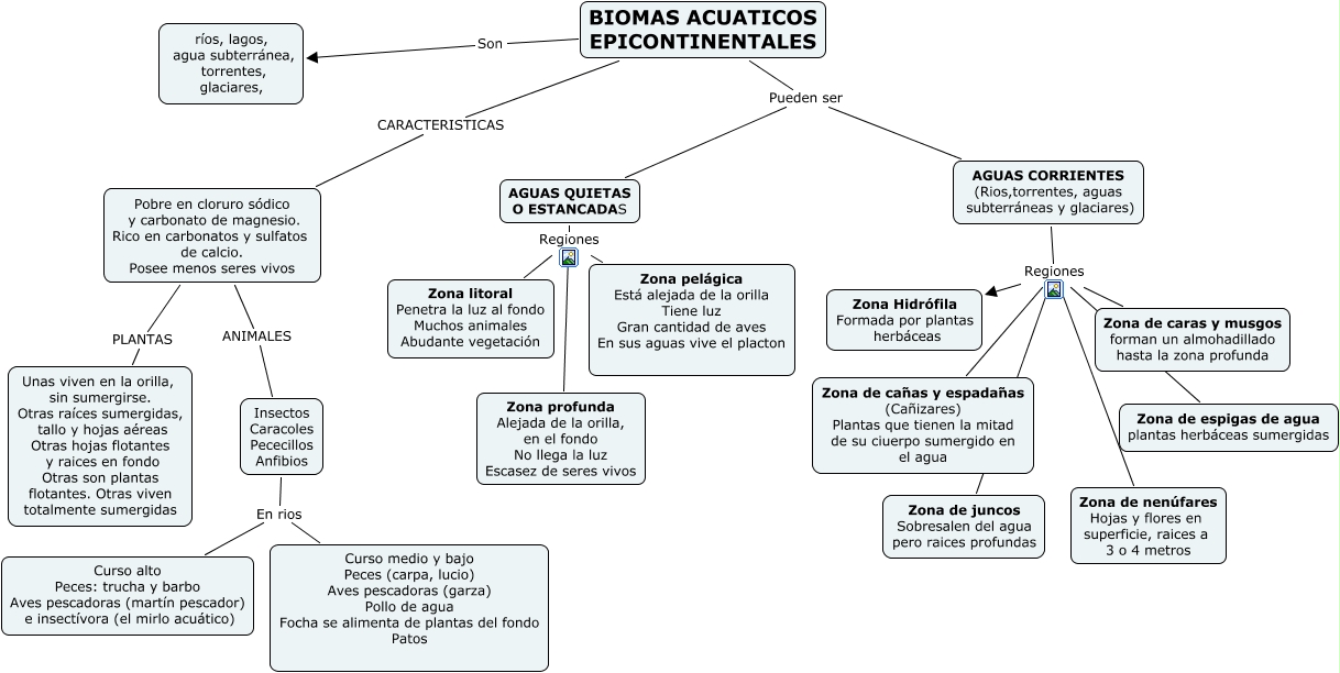 Este Cmap, tiene información relacionada con: BIOMAS ACUATICOS EPICONTINENTALES, AGUAS CORRIENTES (Rios,torrentes, aguas subterráneas y glaciares) Regiones Zona de caras y musgos forman un almohadillado hasta la zona profunda, AGUAS QUIETAS O ESTANCADAS Regiones Zona litoral Penetra la luz al fondo Muchos animales Abudante vegetación, Pobre en cloruro sódico y carbonato de magnesio. Rico en carbonatos y sulfatos de calcio. Posee menos seres vivos PLANTAS Unas viven en la orilla, sin sumergirse. Otras raíces sumergidas, tallo y hojas aéreas Otras hojas flotantes y raices en fondo Otras son plantas flotantes. Otras viven totalmente sumergidas, AGUAS CORRIENTES (Rios,torrentes, aguas subterráneas y glaciares) Regiones Zona de cañas y espadañas (Cañizares) Plantas que tienen la mitad de su ciuerpo sumergido en el agua, AGUAS CORRIENTES (Rios,torrentes, aguas subterráneas y glaciares) Regiones Zona Hidrófila Formada por plantas herbáceas, Insectos Caracoles Pececillos Anfibios En rios Curso medio y bajo Peces (carpa, lucio) Aves pescadoras (garza) Pollo de agua Focha se alimenta de plantas del fondo Patos, BIOMAS ACUATICOS EPICONTINENTALES CARACTERISTICAS Pobre en cloruro sódico y carbonato de magnesio. Rico en carbonatos y sulfatos de calcio. Posee menos seres vivos, AGUAS QUIETAS O ESTANCADAS Regiones Zona profunda Alejada de la orilla, en el fondo No llega la luz Escasez de seres vivos, AGUAS CORRIENTES (Rios,torrentes, aguas subterráneas y glaciares) Regiones Zona de nenúfares Hojas y flores en superficie, raices a 3 o 4 metros, AGUAS CORRIENTES (Rios,torrentes, aguas subterráneas y glaciares) Regiones Zona de juncos Sobresalen del agua pero raices profundas, BIOMAS ACUATICOS EPICONTINENTALES Pueden ser AGUAS CORRIENTES (Rios,torrentes, aguas subterráneas y glaciares), Insectos Caracoles Pececillos Anfibios En rios Curso alto Peces: trucha y barbo Aves pescadoras (martín pescador) e insectívora (el mirlo acuático), AGUAS QUIETAS O ESTANCADAS Regiones Zona pelágica Está alejada de la orilla Tiene luz Gran cantidad de aves En sus aguas vive el placton, Pobre en cloruro sódico y carbonato de magnesio. Rico en carbonatos y sulfatos de calcio. Posee menos seres vivos ANIMALES Insectos Caracoles Pececillos Anfibios, AGUAS CORRIENTES (Rios,torrentes, aguas subterráneas y glaciares) Regiones Zona de espigas de agua plantas herbáceas sumergidas, BIOMAS ACUATICOS EPICONTINENTALES Son ríos, lagos, agua subterránea, torrentes, glaciares,, BIOMAS ACUATICOS EPICONTINENTALES Pueden ser AGUAS QUIETAS O ESTANCADAS