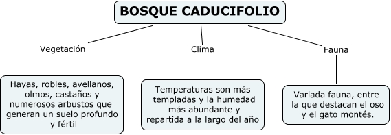 Este Cmap, tiene información relacionada con: BOSQUE CADUCIFOLIO, BOSQUE CADUCIFOLIO Clima Temperaturas son más templadas y la humedad más abundante y repartida a la largo del año, BOSQUE CADUCIFOLIO Fauna Variada fauna, entre la que destacan el oso y el gato montés., BOSQUE CADUCIFOLIO Vegetación Hayas, robles, avellanos, olmos, castaños y numerosos arbustos que generan un suelo profundo y fértil