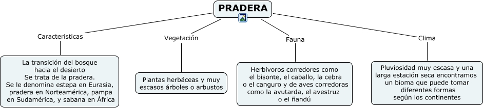 Este Cmap, tiene información relacionada con: PRADERA, PRADERA Clima Pluviosidad muy escasa y una larga estación seca encontramos un bioma que puede tomar diferentes formas según los continentes, PRADERA Caracteristicas La transición del bosque hacia el desierto Se trata de la pradera. Se le denomina estepa en Eurasia, pradera en Norteamérica, pampa en Sudamérica, y sabana en África, PRADERA Fauna Herbívoros corredores como el bisonte, el caballo, la cebra o el canguro y de aves corredoras como la avutarda, el avestruz o el ñandú, PRADERA Vegetación Plantas herbáceas y muy escasos árboles o arbustos