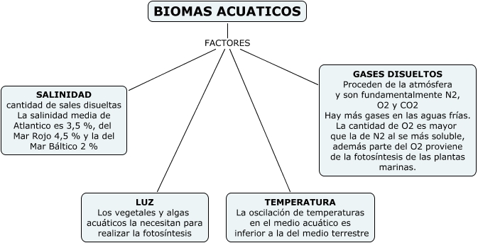 Este Cmap, tiene información relacionada con: FACOTES BIOMAS ACUATICOS, BIOMAS ACUATICOS FACTORES SALINIDAD cantidad de sales disueltas La salinidad media de Atlantico es 3,5 %, del Mar Rojo 4,5 % y la del Mar Báltico 2 %, BIOMAS ACUATICOS FACTORES GASES DISUELTOS Proceden de la atmósfera y son fundamentalmente N2, O2 y CO2 Hay más gases en las aguas frías. La cantidad de O2 es mayor que la de N2 al se más soluble, además parte del O2 proviene de la fotosíntesis de las plantas marinas., BIOMAS ACUATICOS FACTORES TEMPERATURA La oscilación de temperaturas en el medio acuático es inferior a la del medio terrestre, BIOMAS ACUATICOS FACTORES LUZ Los vegetales y algas acuáticos la necesitan para realizar la fotosíntesis
