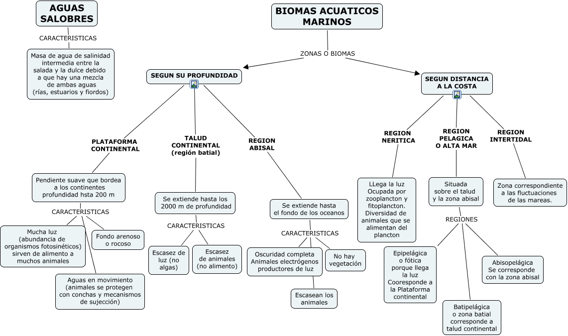 Este Cmap, tiene información relacionada con: BIOMAS ACUATICOS MARINOS Y SALOBRES, SEGUN DISTANCIA A LA COSTA REGION INTERTIDAL Zona correspondiente a las fluctuaciones de las mareas., Se extiende hasta el fondo de los oceanos CARACTERISTICAS No hay vegetación, Pendiente suave que bordea a los continentes profundidad hsta 200 m CARACTERISTICAS Fondo arenoso o rocoso, Situada sobre el talud y la zona abisal REGIONES Batipelágica o zona batial corresponde a talud continental, Situada sobre el talud y la zona abisal REGIONES Abisopelágica Se corresponde con la zona abisal, SEGUN SU PROFUNDIDAD REGION ABISAL Se extiende hasta el fondo de los oceanos, BIOMAS ACUATICOS MARINOS ZONAS O BIOMAS SEGUN SU PROFUNDIDAD, Se extiende hasta el fondo de los oceanos CARACTERISTICAS Oscuridad completa Animales electrógenos productores de luz, Pendiente suave que bordea a los continentes profundidad hsta 200 m CARACTERISTICAS Aguas en movimiento (animales se protegen con conchas y mecanismos de sujección), SEGUN SU PROFUNDIDAD TALUD CONTINENTAL (región batial) Se extiende hasta los 2000 m de profundidad, SEGUN DISTANCIA A LA COSTA REGION PELAGICA O ALTA MAR Situada sobre el talud y la zona abisal, Se extiende hasta los 2000 m de profundidad CARACTERISTICAS Escasez de luz (no algas), Se extiende hasta el fondo de los oceanos CARACTERISTICAS Escasean los animales, SEGUN DISTANCIA A LA COSTA REGION NERITICA LLega la luz Ocupada por zooplancton y fitoplancton. Diversidad de animales que se alimentan del plancton, AGUAS SALOBRES CARACTERISTICAS Masa de agua de salinidad intermedia entre la salada y la dulce debido a que hay una mezcla de ambas aguas (rías, estuarios y fiordos), Pendiente suave que bordea a los continentes profundidad hsta 200 m CARACTERISTICAS Mucha luz (abundancia de organismos fotosinéticos) sirven de alimento a muchos animales, BIOMAS ACUATICOS MARINOS ZONAS O BIOMAS SEGUN DISTANCIA A LA COSTA, Se extiende hasta los 2000 m de profundidad CARACTERISTICAS Escasez de animales (no alimento), SEGUN SU PROFUNDIDAD PLATAFORMA CONTINENTAL Pendiente suave que bordea a los continentes profundidad hsta 200 m, Situada sobre el talud y la zona abisal REGIONES Epipelágica o fótica porque llega la luz Cooresponde a la Plataforma continental