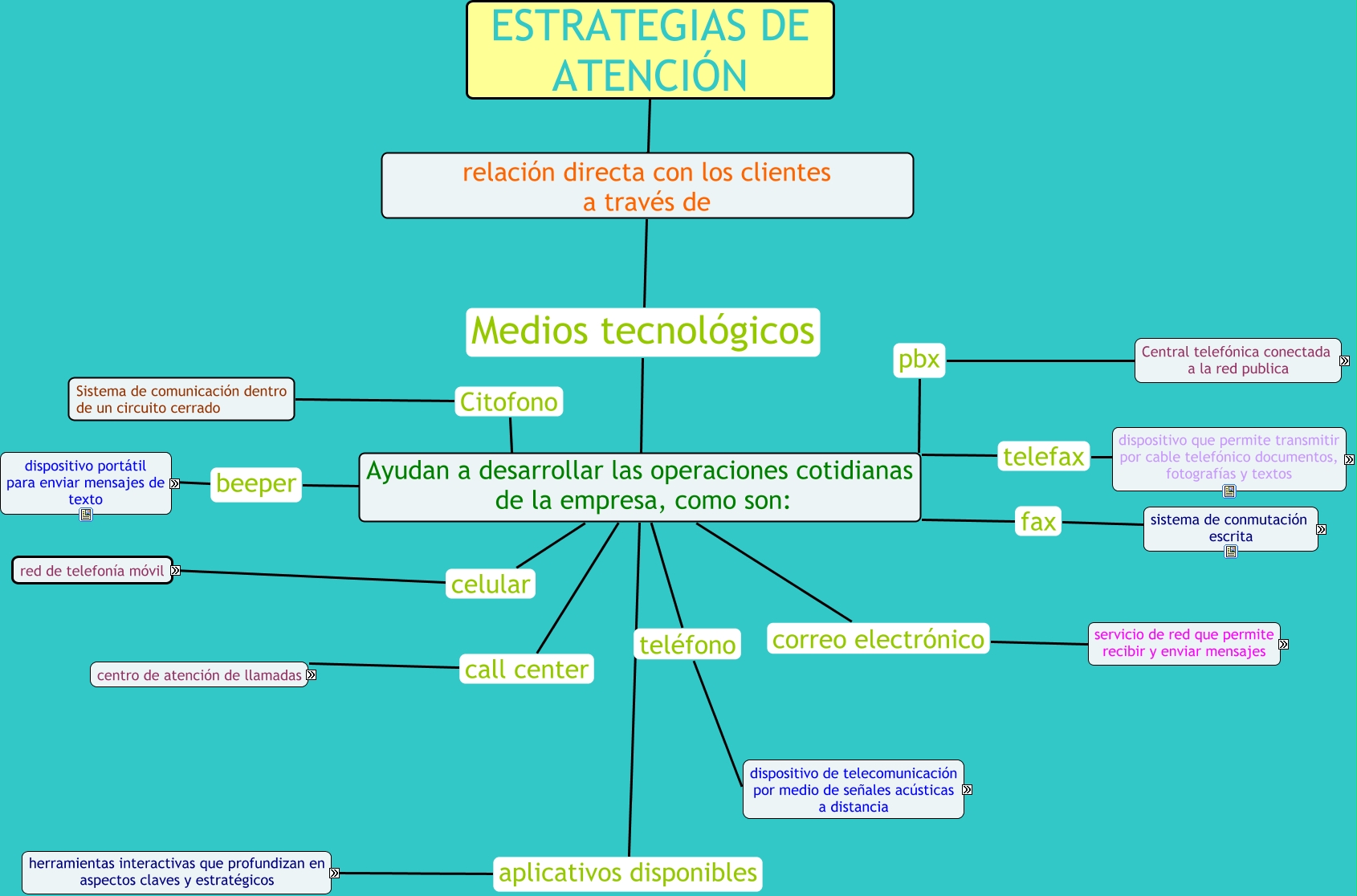 Este Cmap, tiene información relacionada con: Estrategias de atencion, Ayudan a desarrollar las operaciones cotidianas de la empresa, como son: call center centro de atención de llamadas, sistema de conmutación escrita fax Ayudan a desarrollar las operaciones cotidianas de la empresa, como son:, Ayudan a desarrollar las operaciones cotidianas de la empresa, como son: correo electrónico servicio de red que permite recibir y enviar mensajes, Ayudan a desarrollar las operaciones cotidianas de la empresa, como son: celular red de telefonía móvil, relación directa con los clientes a través de Medios tecnológicos Ayudan a desarrollar las operaciones cotidianas de la empresa, como son:, ESTRATEGIAS DE ATENCIÓN ???? relación directa con los clientes a través de, dispositivo que permite transmitir por cable telefónico documentos, fotografías y textos telefax Ayudan a desarrollar las operaciones cotidianas de la empresa, como son:, Ayudan a desarrollar las operaciones cotidianas de la empresa, como son: aplicativos disponibles herramientas interactivas que profundizan en aspectos claves y estratégicos, Ayudan a desarrollar las operaciones cotidianas de la empresa, como son: Citofono Sistema de comunicación dentro de un circuito cerrado, Ayudan a desarrollar las operaciones cotidianas de la empresa, como son: teléfono dispositivo de telecomunicación por medio de señales acústicas a distancia, Ayudan a desarrollar las operaciones cotidianas de la empresa, como son: beeper dispositivo portátil para enviar mensajes de texto, Central telefónica conectada a la red publica pbx Ayudan a desarrollar las operaciones cotidianas de la empresa, como son: