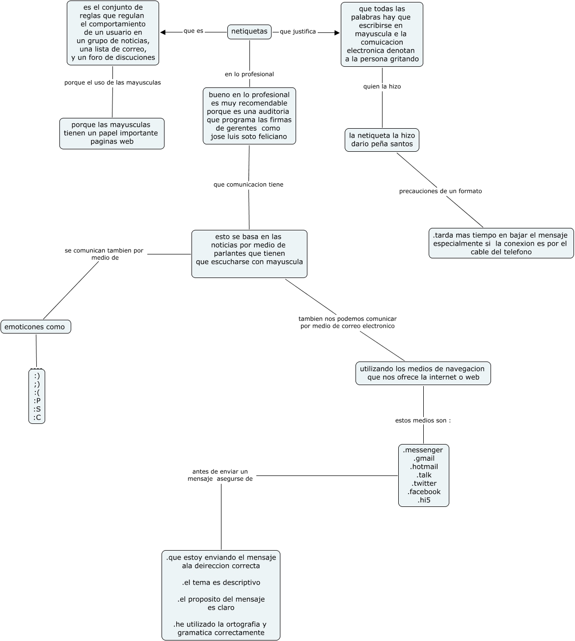 Este Cmap, tiene información relacionada con: junior, que todas las palabras hay que escribirse en mayuscula e la comuicacion electronica denotan a la persona gritando quien la hizo la netiqueta la hizo dario peña santos, .messenger .gmail .hotmail .talk .twitter .facebook .hi5 antes de enviar un mensaje asegurse de .que estoy enviando el mensaje ala deireccion correcta .el tema es descriptivo .el proposito del mensaje es claro .he utilizado la ortografia y gramatica correctamente, bueno en lo profesional es muy recomendable porque es una auditoria que programa las firmas de gerentes como jose luis soto feliciano que comunicacion tiene esto se basa en las noticias por medio de parlantes que tienen que escucharse con mayuscula, utilizando los medios de navegacion que nos ofrece la internet o web estos medios son : .messenger .gmail .hotmail .talk .twitter .facebook .hi5, netiquetas que es es el conjunto de reglas que regulan el comportamiento de un usuario en un grupo de noticias, una lista de correo, y un foro de discuciones, es el conjunto de reglas que regulan el comportamiento de un usuario en un grupo de noticias, una lista de correo, y un foro de discuciones porque el uso de las mayusculas porque las mayusculas tienen un papel importante paginas web, netiquetas en lo profesional bueno en lo profesional es muy recomendable porque es una auditoria que programa las firmas de gerentes como jose luis soto feliciano, netiquetas que justifica que todas las palabras hay que escribirse en mayuscula e la comuicacion electronica denotan a la persona gritando, esto se basa en las noticias por medio de parlantes que tienen que escucharse con mayuscula se comunican tambien por medio de emoticones como, emoticones como ???? :) ;) :( :P :S :C, esto se basa en las noticias por medio de parlantes que tienen que escucharse con mayuscula tambien nos podemos comunicar por medio de correo electronico utilizando los medios de navegacion que nos ofrece la internet o web, la netiqueta la hizo dario peña santos precauciones de un formato .tarda mas tiempo en bajar el mensaje especialmente si la conexion es por el cable del telefono
