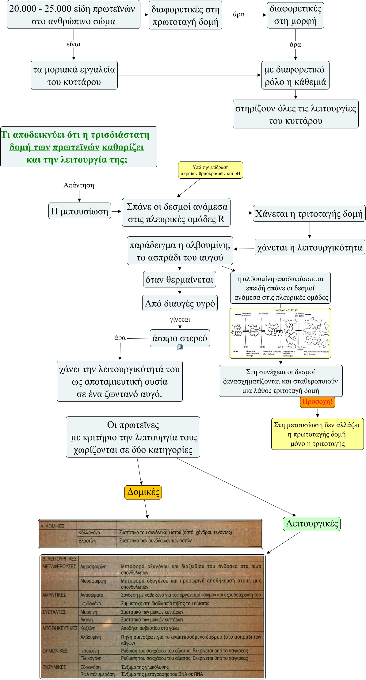 This Concept Map, created with IHMC CmapTools, has information related to: Λειτουργία και Ρόλος πρωτεϊνών, 20.000 - 25.000 είδη πρωτεϊνών στο ανθρώπινο σώμα διαφορετικές στη πρωτοταγή δομή, με διαφορετικό ρόλο η κάθεμιά στηρίζουν όλες τις λειτουργίες του κυττάρου, Δομικές, Προσοχή! Στη μετουσίωση δεν αλλάζει η πρωτοταγής δομή μόνο η τριτοταγής, Σπάνε οι δεσμοί ανάμεσα στις πλευρικές ομάδες R Χάνεται η τριτοταγής δομή, η αλβουμίνη αποδιατάσσεται επειδή σπάνε οι δεσμοί ανάμεσα στις πλευρικές ομάδες ????, Υπό την επίδραση ακραίων θρμοκρασιών και pH Σπάνε οι δεσμοί ανάμεσα στις πλευρικές ομάδες R, άσπρο στερεό άρα χάνει την λειτουργικότητά του ως αποταμιευτική ουσία σε ένα ζωντανό αυγό., Από διαυγές υγρό γίνεται άσπρο στερεό, Λειτουργικές, Οι πρωτεϊνες με κριτήριο την λειτουργία τους χωρίζονται σε δύο κατηγορίες Δομικές, 20.000 - 25.000 είδη πρωτεϊνών στο ανθρώπινο σώμα είναι τα μοριακά εργαλεία του κυττάρου, Οι πρωτεϊνες με κριτήριο την λειτουργία τους χωρίζονται σε δύο κατηγορίες Λειτουργικές, Η μετουσίωση Σπάνε οι δεσμοί ανάμεσα στις πλευρικές ομάδες R, παράδειγμα η αλβουμίνη, το ασπράδι του αυγού η αλβουμίνη αποδιατάσσεται επειδή σπάνε οι δεσμοί ανάμεσα στις πλευρικές ομάδες, διαφορετικές στη πρωτοταγή δομή άρα διαφορετικές στη μορφή, Τι αποδεικνύει ότι η τρισδιάστατη δομή των πρωτεϊνών καθορίζει και την λειτουργία της; Απάντηση Η μετουσίωση, Χάνεται η τριτοταγής δομή χάνεται η λειτουργικότητα, χάνεται η λειτουργικότητα παράδειγμα η αλβουμίνη, το ασπράδι του αυγού, τα μοριακά εργαλεία του κυττάρου με διαφορετικό ρόλο η κάθεμιά