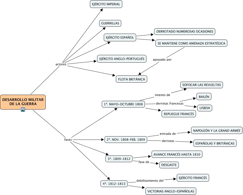 Este Cmap, tiene información relacionada con: Desarrollo militar, DESARROLLO MILITAR DE LA GUERRA actores EJÉRCITO ESPAÑOL, DESARROLLO MILITAR DE LA GUERRA actores EJÉRCITO IMPERIAL, 1ª. MAYO-OCTUBRE 1808 intento de SOFOCAR LAS REVUELTAS, DESARROLLO MILITAR DE LA GUERRA actores EJÉRCITO ANGLO-PORTUGUÉS, 2ª. NOV. 1808-FEB. 1809 entrada de NAPOLEÓN Y LA GRAND ARMÉE, DESARROLLO MILITAR DE LA GUERRA actores GUERRILLAS, 1ª. MAYO-OCTUBRE 1808 derrotas francesas LISBOA, 4ª. 1812-1813 debilitamiento del EJÉRCITO FRANCÉS, 3ª. 1809-1812 AVANCE FRANCÉS HASTA 1810, SE MANTIENE COMO AMENAZA ESTRATÉGICA apoyado por FLOTA BRITÁNICA, EJÉRCITO ESPAÑOL SE MANTIENE COMO AMENAZA ESTRATÉGICA, 4ª. 1812-1813 VICTORIAS ANGLO-ESPAÑOLAS, 3ª. 1809-1812 fase de DESGASTE, DESARROLLO MILITAR DE LA GUERRA fases 1ª. MAYO-OCTUBRE 1808, DESARROLLO MILITAR DE LA GUERRA actores FLOTA BRITÁNICA, DESARROLLO MILITAR DE LA GUERRA fases 3ª. 1809-1812, 1ª. MAYO-OCTUBRE 1808 derrotas francesas BAILÉN, EJÉRCITO ESPAÑOL DERROTADO NUMEROSAS OCASIONES, 2ª. NOV. 1808-FEB. 1809 derrotas ESPAÑOLAS Y BRITÁNICAS, DESARROLLO MILITAR DE LA GUERRA fases 4ª. 1812-1813