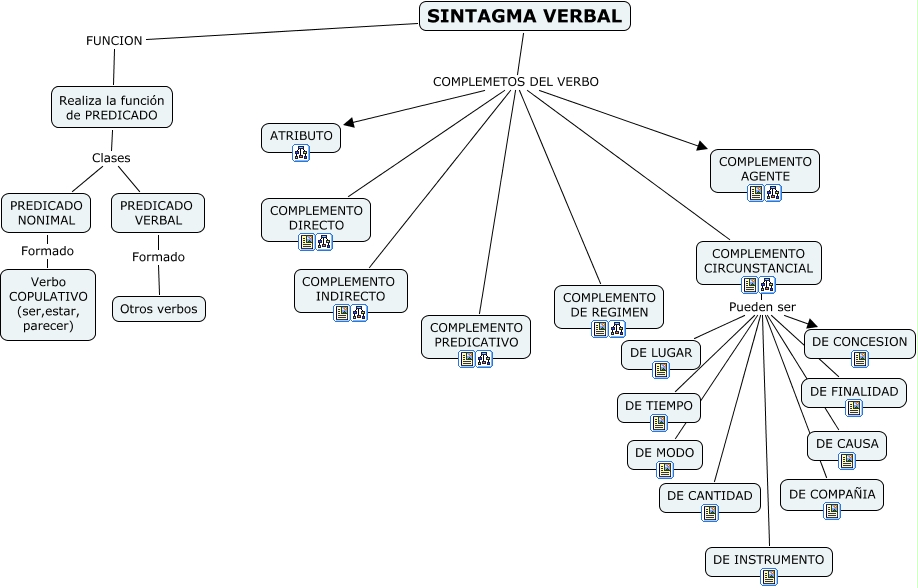 Este Cmap, tiene información relacionada con: 5.- SINTAGMA VERBAL, SINTAGMA VERBAL COMPLEMETOS DEL VERBO COMPLEMENTO AGENTE, SINTAGMA VERBAL COMPLEMETOS DEL VERBO ATRIBUTO, COMPLEMENTO CIRCUNSTANCIAL Pueden ser DE LUGAR, SINTAGMA VERBAL COMPLEMETOS DEL VERBO COMPLEMENTO CIRCUNSTANCIAL, COMPLEMENTO CIRCUNSTANCIAL Pueden ser DE CAUSA, SINTAGMA VERBAL COMPLEMETOS DEL VERBO COMPLEMENTO PREDICATIVO, COMPLEMENTO CIRCUNSTANCIAL Pueden ser DE TIEMPO, COMPLEMENTO CIRCUNSTANCIAL Pueden ser DE CANTIDAD, SINTAGMA VERBAL COMPLEMETOS DEL VERBO COMPLEMENTO DE REGIMEN, COMPLEMENTO CIRCUNSTANCIAL Pueden ser DE COMPAÑIA, Realiza la función de PREDICADO Clases PREDICADO VERBAL, COMPLEMENTO CIRCUNSTANCIAL Pueden ser DE CONCESION, SINTAGMA VERBAL COMPLEMETOS DEL VERBO COMPLEMENTO INDIRECTO, Realiza la función de PREDICADO Clases PREDICADO NONIMAL, SINTAGMA VERBAL COMPLEMETOS DEL VERBO COMPLEMENTO DIRECTO, COMPLEMENTO CIRCUNSTANCIAL Pueden ser DE MODO, PREDICADO VERBAL Formado Otros verbos, SINTAGMA VERBAL FUNCION Realiza la función de PREDICADO, PREDICADO NONIMAL Formado Verbo COPULATIVO (ser,estar, parecer), COMPLEMENTO CIRCUNSTANCIAL Pueden ser DE FINALIDAD