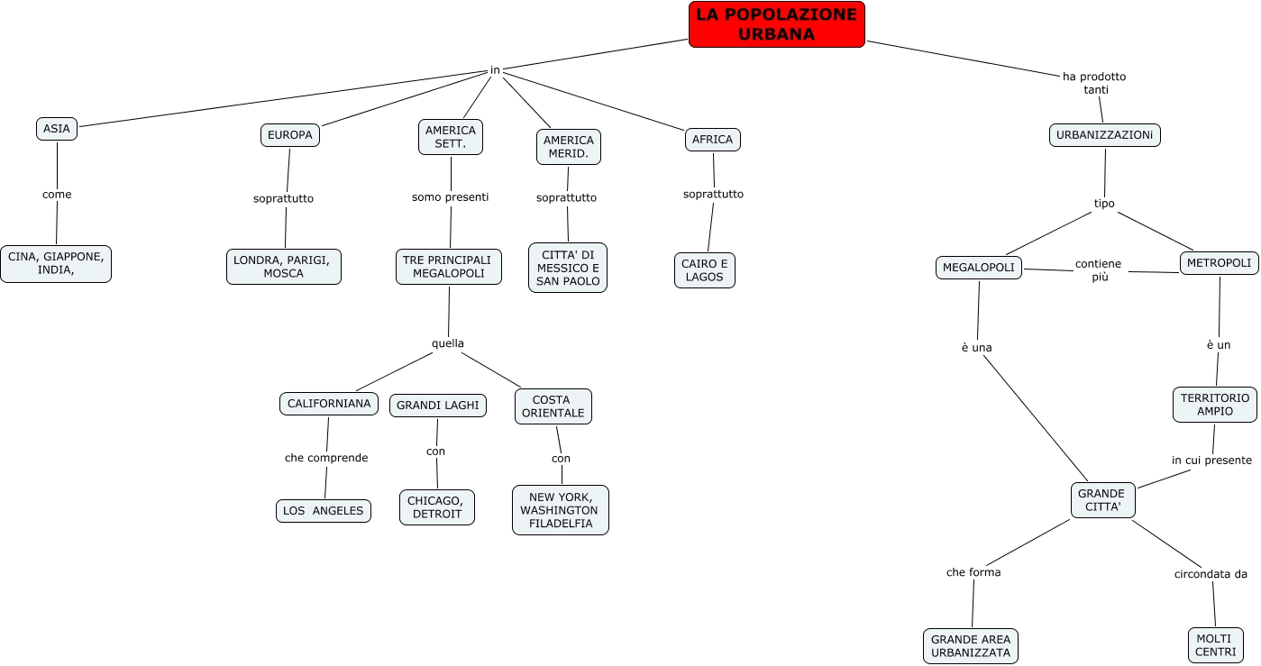 Questa Cmap, creata con IHMC CmapTools, contiene informazioni relative a: popolazione urbana, LA POPOLAZIONE URBANA in AMERICA MERID., LA POPOLAZIONE URBANA in AFRICA, COSTA ORIENTALE con NEW YORK, WASHINGTON FILADELFIA, AMERICA SETT. somo presenti TRE PRINCIPALI MEGALOPOLI, LA POPOLAZIONE URBANA in ASIA, GRANDE CITTA' che forma GRANDE AREA URBANIZZATA, EUROPA soprattutto LONDRA, PARIGI, MOSCA, TRE PRINCIPALI MEGALOPOLI quella COSTA ORIENTALE, TRE PRINCIPALI MEGALOPOLI quella CALIFORNIANA, LA POPOLAZIONE URBANA ha prodotto tanti URBANIZZAZIONi, AMERICA MERID. soprattutto CITTA' DI MESSICO E SAN PAOLO, LA POPOLAZIONE URBANA in AMERICA SETT., METROPOLI è un TERRITORIO AMPIO, URBANIZZAZIONi tipo METROPOLI, GRANDI LAGHI con CHICAGO, DETROIT, URBANIZZAZIONi tipo MEGALOPOLI, MEGALOPOLI contiene più METROPOLI, CALIFORNIANA che comprende LOS ANGELES, LA POPOLAZIONE URBANA in EUROPA, MEGALOPOLI è una GRANDE CITTA'