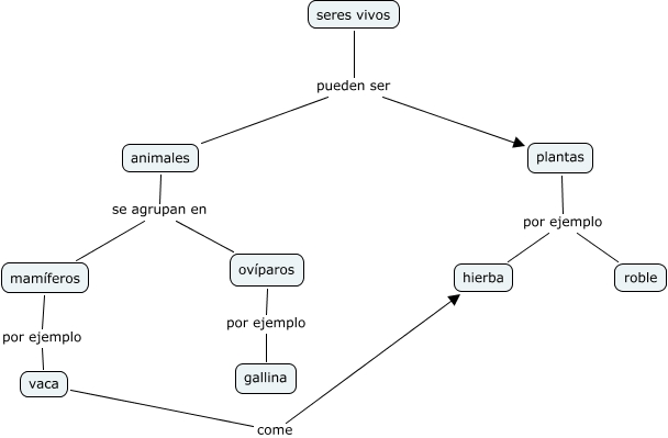 Este Cmap, tiene información relacionada con: comprobar y reflexionar, mamíferos por ejemplo vaca, ovíparos por ejemplo gallina, animales se agrupan en ovíparos, plantas por ejemplo hierba, seres vivos pueden ser animales, vaca come hierba, animales se agrupan en mamíferos, plantas por ejemplo roble, seres vivos pueden ser plantas