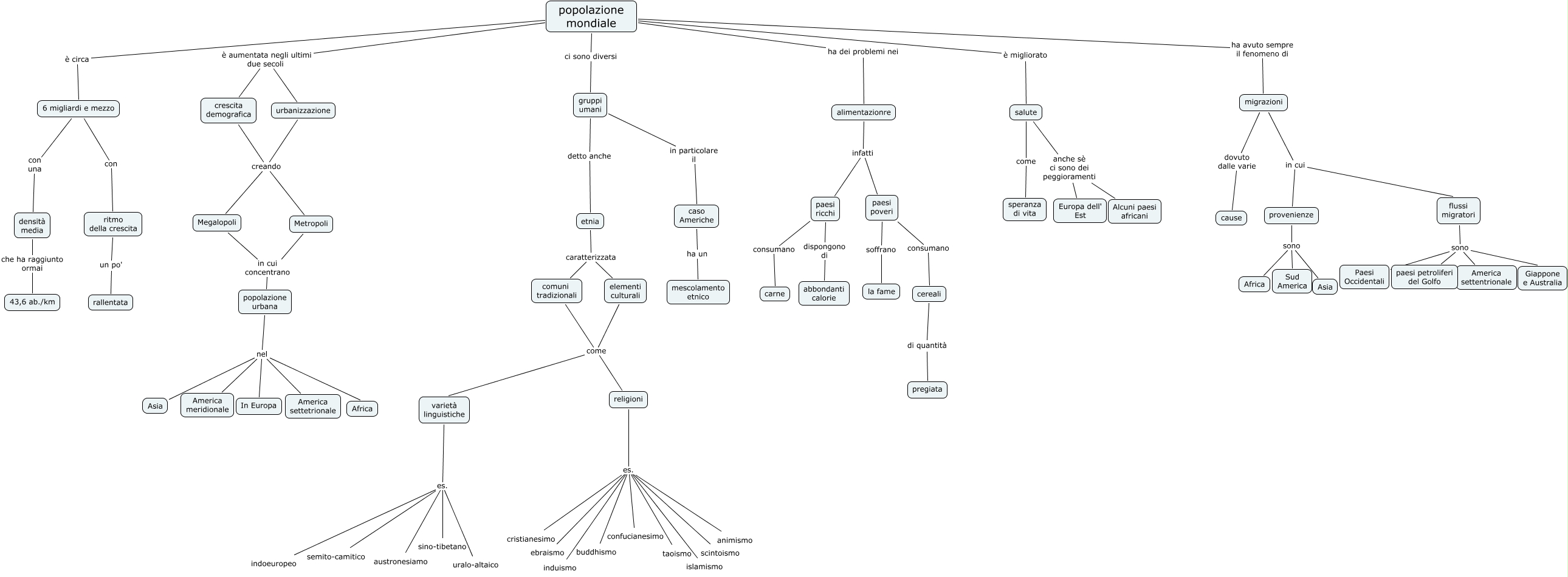 Questa Cmap, creata con IHMC CmapTools, contiene informazioni relative a: La popolazione mondiale, gruppi umani detto anche etnia, flussi migratori sono Giappone e Australia, comuni tradizionali come religioni, popolazione mondiale ci sono diversi gruppi umani, religioni es. animismo, religioni es. islamismo, popolazione urbana nel America meridionale, migrazioni dovuto dalle varie cause, popolazione mondiale è circa 6 migliardi e mezzo, ritmo della crescita un po' rallentata, urbanizzazione creando Metropoli, densità media che ha raggiunto ormai 43,6 ab./km, alimentazionre infatti paesi poveri, varietà linguistiche es. austronesiamo, migrazioni in cui flussi migratori, paesi ricchi dispongono di abbondanti calorie, Megalopoli in cui concentrano popolazione urbana, crescita demografica creando Megalopoli, religioni es. scintoismo, popolazione mondiale ha avuto sempre il fenomeno di migrazioni