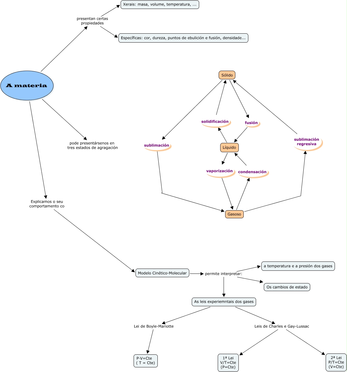Este Cmap, tiene información relacionada con: Os sistemas materiais, Sólido sublimación Gasoso, Gasoso condensación Líquido, Líquido vaporización Gasoso, Sólido fusión Líquido, Modelo Cinético-Molecular permite interpretar: As leis experiemntais dos gases, A materia presentan certas propiedades Específicas: cor, dureza, puntos de ebulición e fusión, densidade..., A materia Explicamos o seu comportamento co Modelo Cinético-Molecular, Modelo Cinético-Molecular permite interpretar: Os cambios de estado, As leis experiemntais dos gases Leis de Charles e Gay-Lussac 1ª Lei V/T=Cte (P=Cte), Gasoso sublimación regresiva Sólido, As leis experiemntais dos gases Leis de Charles e Gay-Lussac 2ª Lei P/T=Cte (V=Cte), A materia pode presentársenos en tres estados de agragación Sólido, A materia presentan certas propiedades Xerais: masa, volume, temperatura, ..., As leis experiemntais dos gases Lei de Boyle-Mariotte P·V=Cte ( T = Cte), Líquido solidificación Sólido, Modelo Cinético-Molecular permite interpretar: a temperatura e a presión dos gases