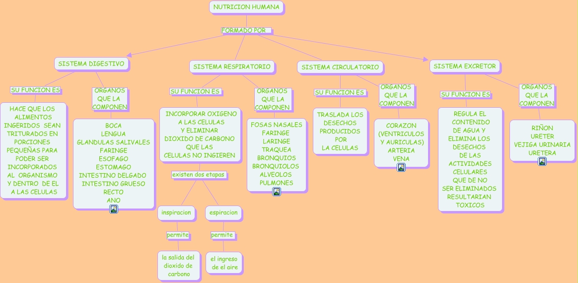 Este Cmap, tiene información relacionada con: biologia primero, SISTEMA RESPIRATORIO SU FUNCION ES INCORPORAR OXIGENO A LAS CELULAS Y ELIMINAR DIOXIDO DE CARBONO QUE LAS CELULAS NO INGIEREN, SISTEMA DIGESTIVO ORGANOS QUE LA COMPONEN BOCA LENGUA GLANDULAS SALIVALES FARINGE ESOFAGO ESTOMAGO INTESTINO DELGADO INTESTINO GRUESO RECTO ANO, NUTRICION HUMANA FORMADO POR SISTEMA RESPIRATORIO, NUTRICION HUMANA FORMADO POR SISTEMA DIGESTIVO, SISTEMA CIRCULATORIO ORGANOS QUE LA COMPONEN CORAZON (VENTRICULOS Y AURICULAS) ARTERIA VENA, INCORPORAR OXIGENO A LAS CELULAS Y ELIMINAR DIOXIDO DE CARBONO QUE LAS CELULAS NO INGIEREN existen dos etapas espiracion, SISTEMA DIGESTIVO SU FUNCION ES HACE QUE LOS ALIMENTOS INGERIDOS SEAN TRITURADOS EN PORCIONES PEQUEÑAS PARA PODER SER INCORPORADOS AL ORGANISMO Y DENTRO DE EL A LAS CELULAS, NUTRICION HUMANA FORMADO POR SISTEMA EXCRETOR, espiracion permite el ingreso de el aire, INCORPORAR OXIGENO A LAS CELULAS Y ELIMINAR DIOXIDO DE CARBONO QUE LAS CELULAS NO INGIEREN existen dos etapas inspiracion, SISTEMA RESPIRATORIO ORGANOS QUE LA COMPONEN FOSAS NASALES FARINGE LARINGE TRAQUEA BRONQUIOS BRONQUIOLOS ALVEOLOS PULMONES, SISTEMA EXCRETOR SU FUNCION ES REGULA EL CONTENIDO DE AGUA Y ELIMINA LOS DESECHOS DE LAS ACTIVIDADES CELULARES QUE DE NO SER ELIMINADOS RESULTARIAN TOXICOS, inspiracion permite la salida del dioxido de carbono, NUTRICION HUMANA FORMADO POR SISTEMA CIRCULATORIO, SISTEMA CIRCULATORIO SU FUNCION ES TRASLADA LOS DESECHOS PRODUCIDOS POR LA CELULAS, SISTEMA EXCRETOR ORGANOS QUE LA COMPONEN RIÑON URETER VEJIGA URINARIA URETERA