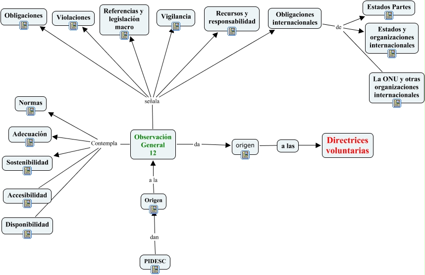 Este Cmap, tiene información relacionada con: Directrices voluntarias, Obligaciones internacionales de Estados y organizaciones internacionales, Obligaciones internacionales de La ONU y otras organizaciones internacionales, Observación General 12 Contempla Sostenibilidad, Obligaciones internacionales de Estados Partes, Observación General 12 Contempla Normas, Observación General 12 señala Obligaciones internacionales, Observación General 12 Contempla Adecuación, Observación General 12 señala Violaciones, Observación General 12 Contempla Accesibilidad, Observación General 12 Contempla Disponibilidad, PIDESC dan Origen, Observación General 12 señala Vigilancia, Origen a la Observación General 12, origen las Directrices voluntarias, Observación General 12 señala Referencias y legislación macro, Observación General 12 señala Recursos y responsabilidad, Observación General 12 da origen, Observación General 12 señala Obligaciones